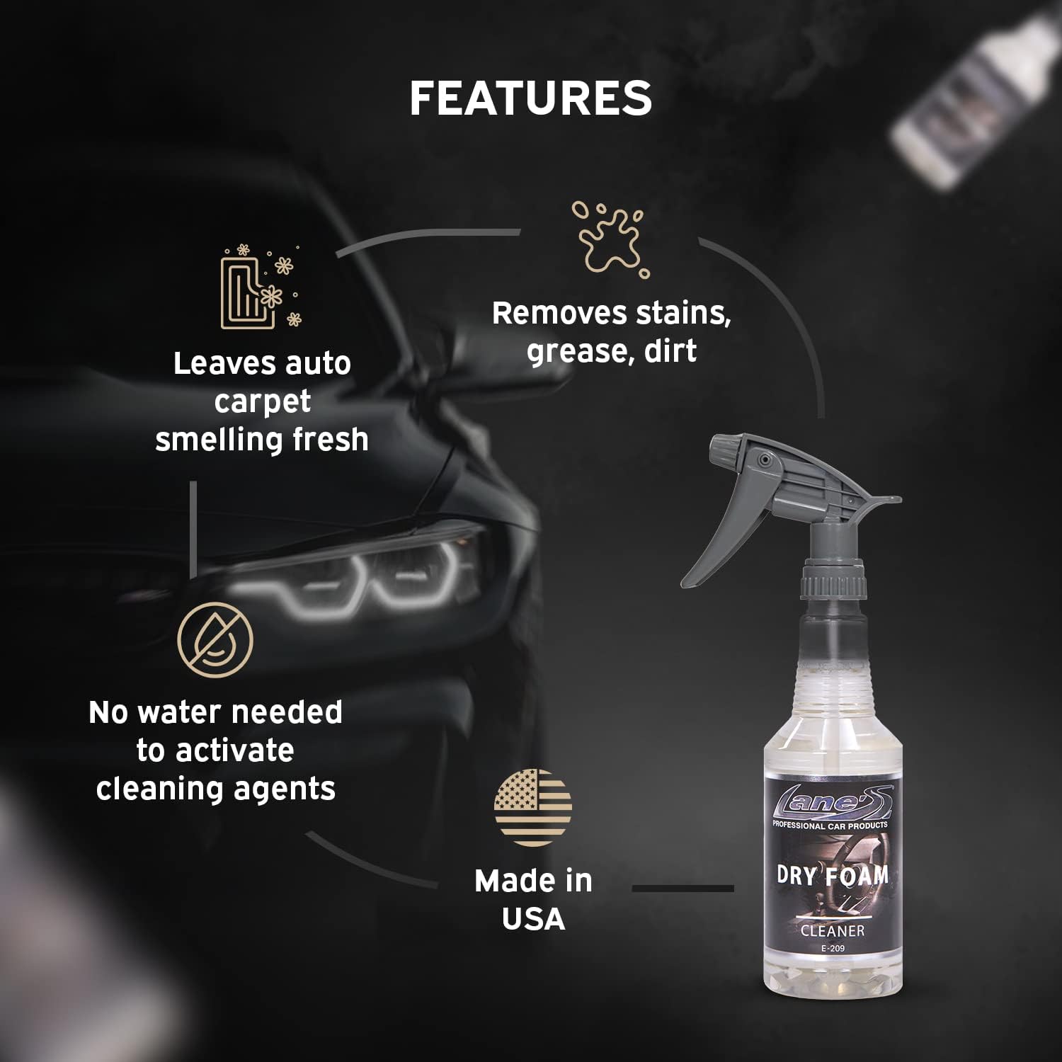 - DRY FOAM CLEANER-: This is a dry foam cleaner that is used without water. Just spray Dry Foam on the carpet or floor mat and agitate with a microfiber towel or carpet brush and vacuum.
