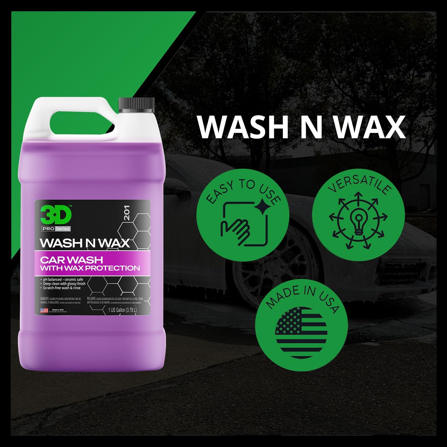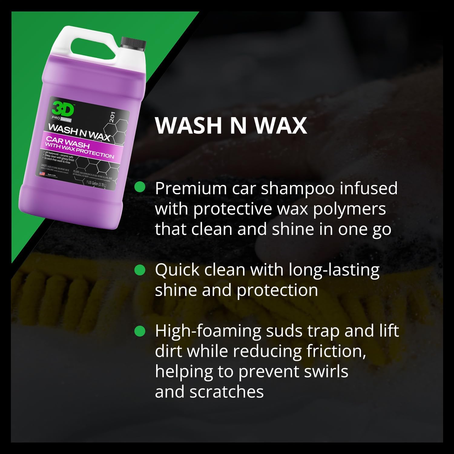 - Wash & Wax In One Step: 3D Wash N Wax is a premium car shampoo infused with protective wax polymers that clean and shine in one go. It delivers a slick, high-gloss finish every time, making your ride look freshly detailed after every wash