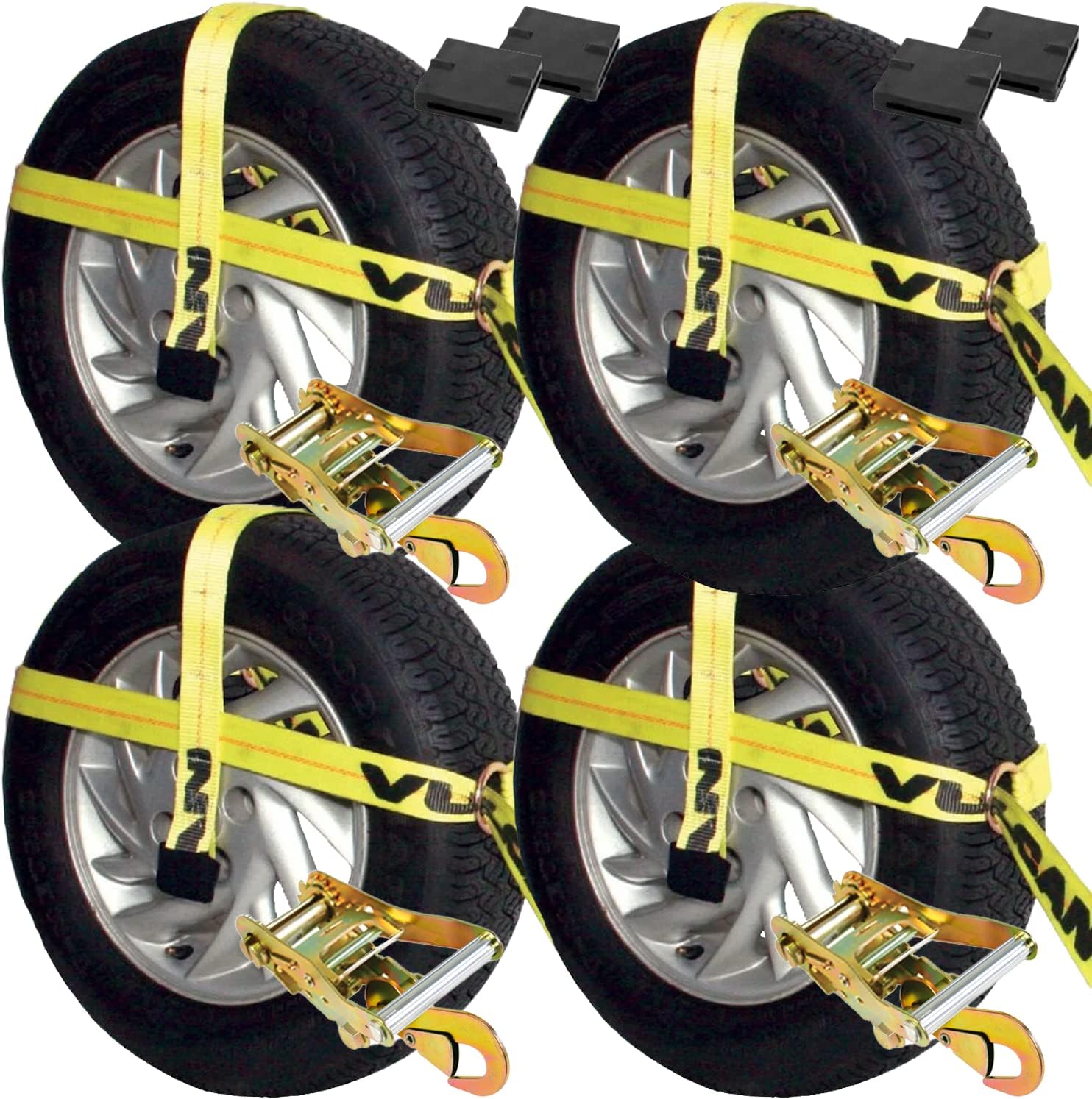 VULCAN Car Tie Down Kit - Adjustable Loop - Snap Hooks - Classic Yellow - Complete Kit Includes 4 Straps and 4 Ratchets