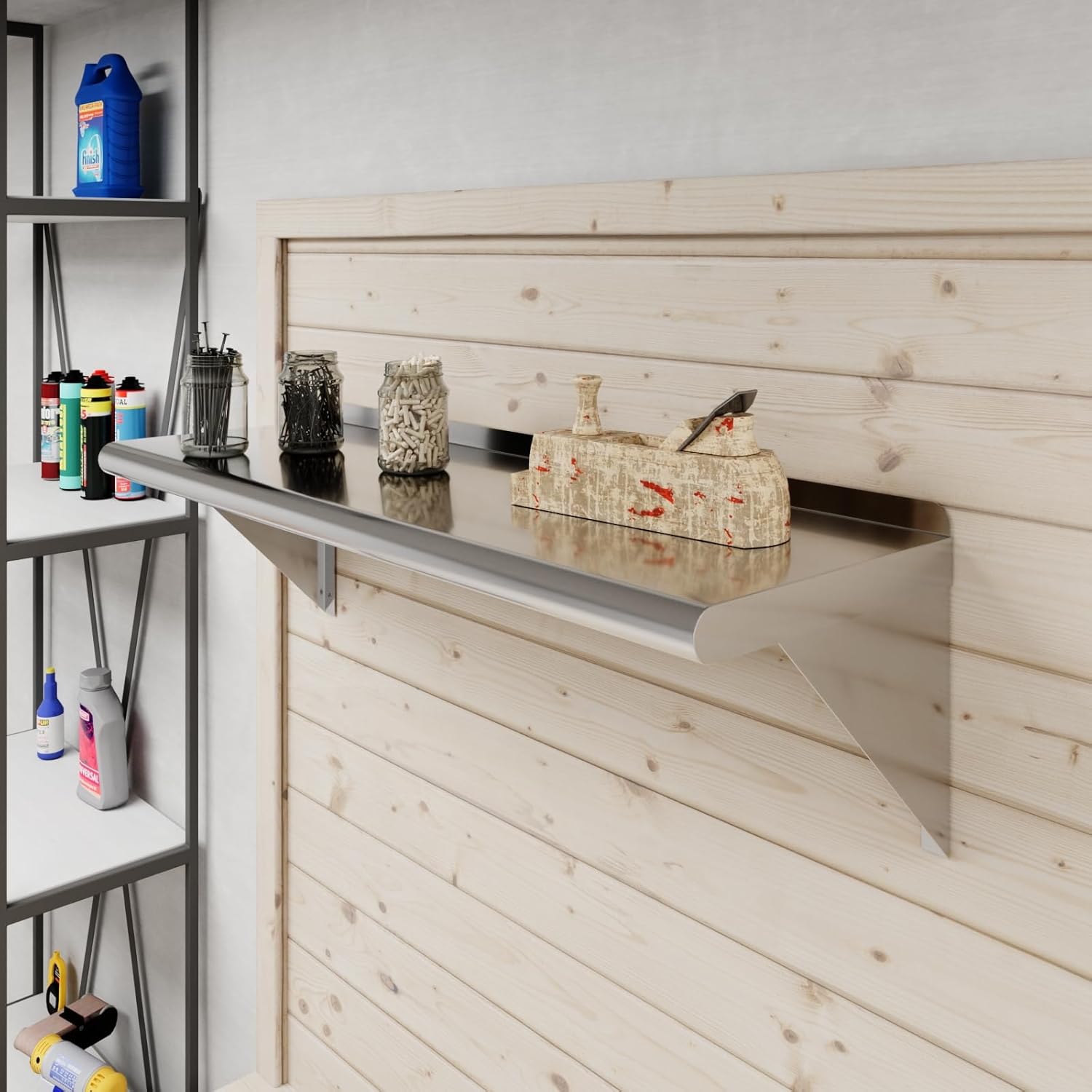 - Its professional, modern and sleek design makes this metal floating shelf perfect for use in any residential or commercial kitchen, food truck, garage, closet, laundry room, utility and equipment room, lab, appliance shelf for toaster and microwave, etc.