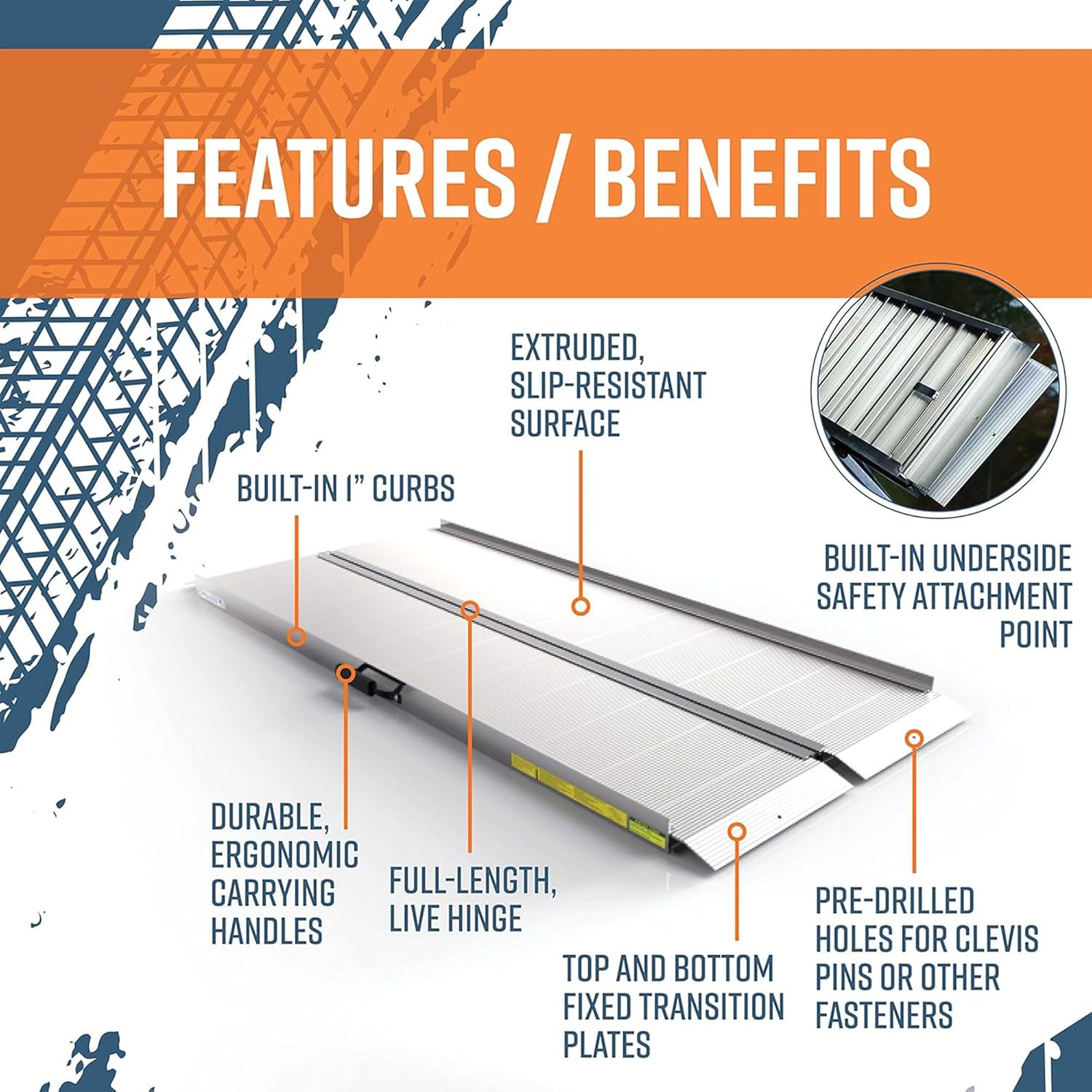 - FULL-LENGTH HINGE: A full-length, live hinge allows uniform weight distribution & eliminates load deflection by dispersing the load throughout the entire ramp, rather than on two hinge points.