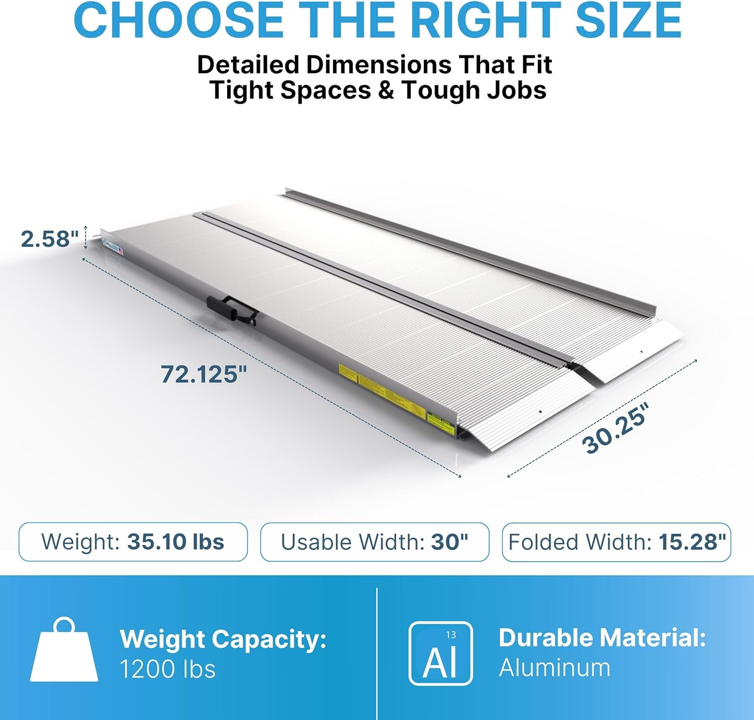 - SAFE & PORTABLE: This ramp folds to 15" wide for easy stowing in truck or van. Slip-resistant surface gives superior traction. Dimensions: 72.125" x 30.25" x 2.575". Weight: 40 lbs. Rated Load: 1200 lbs.