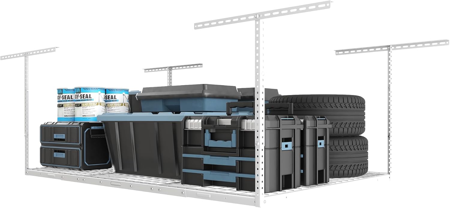 FLEXIMOUNTS 4x6 Overhead Garage Storage Adjustable Ceiling Rack 72" Length x 48" Width x 40" Height, 450lbs Weight Capacity, White