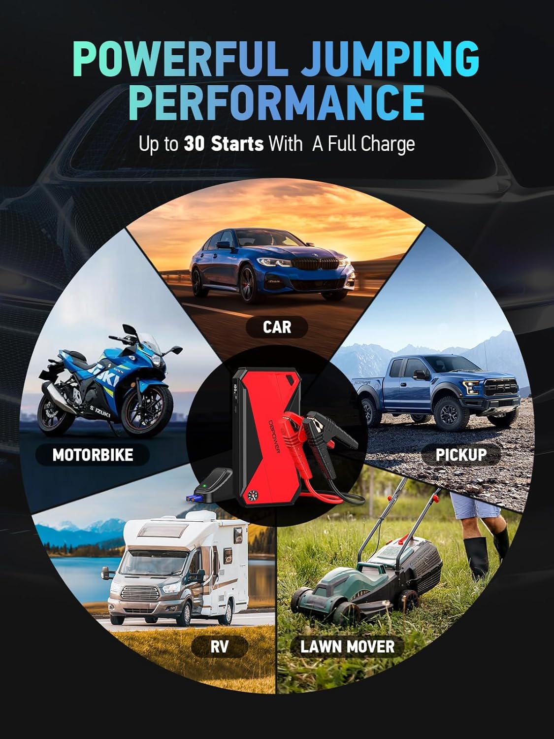 - POWERFUL & COMPACT: Jump start your vehicle (up to 8.0L gas or 6.0L diesel engine) up to 30 times with peak 3000 amps of peak current and heavy-duty clamps and cables. Compact enough to store in your glovebox.