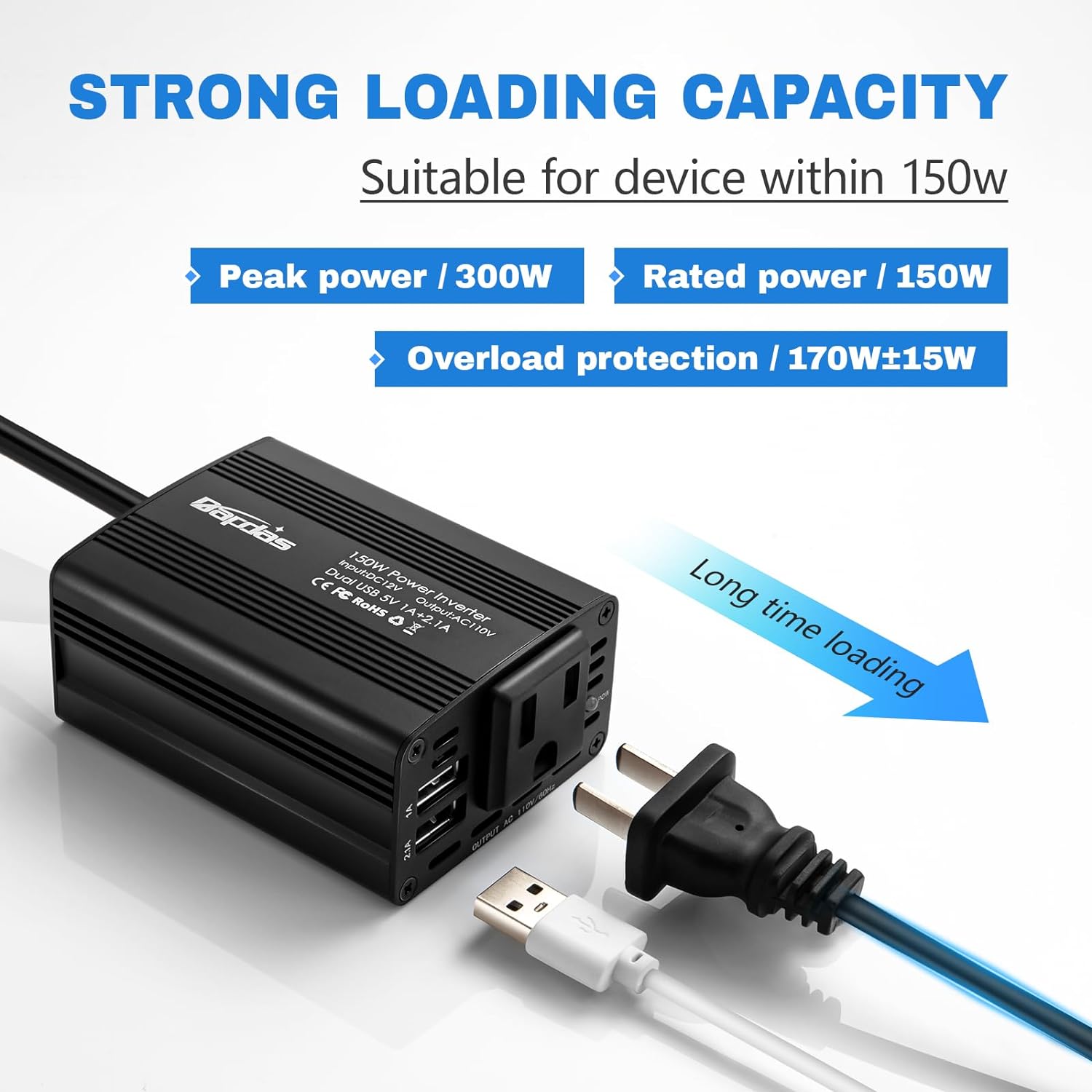 150W Car Power Inverter DC 12V to 110V AC Car Adapter for Plug Outlet with 3.1A Dual USB Car Charger for Laptop Computer-Black