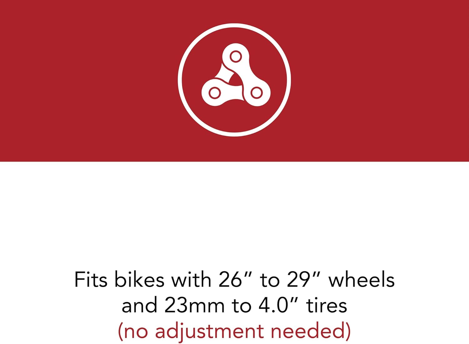 - Reliable Design: Wheel hoop fits 26” to 29” wheels and tires from 23mm to 4.0” with no adjustment needed. Accommodates wheelbases up to 48”, requires no wheel removal, and makes no contact with the bike frame.