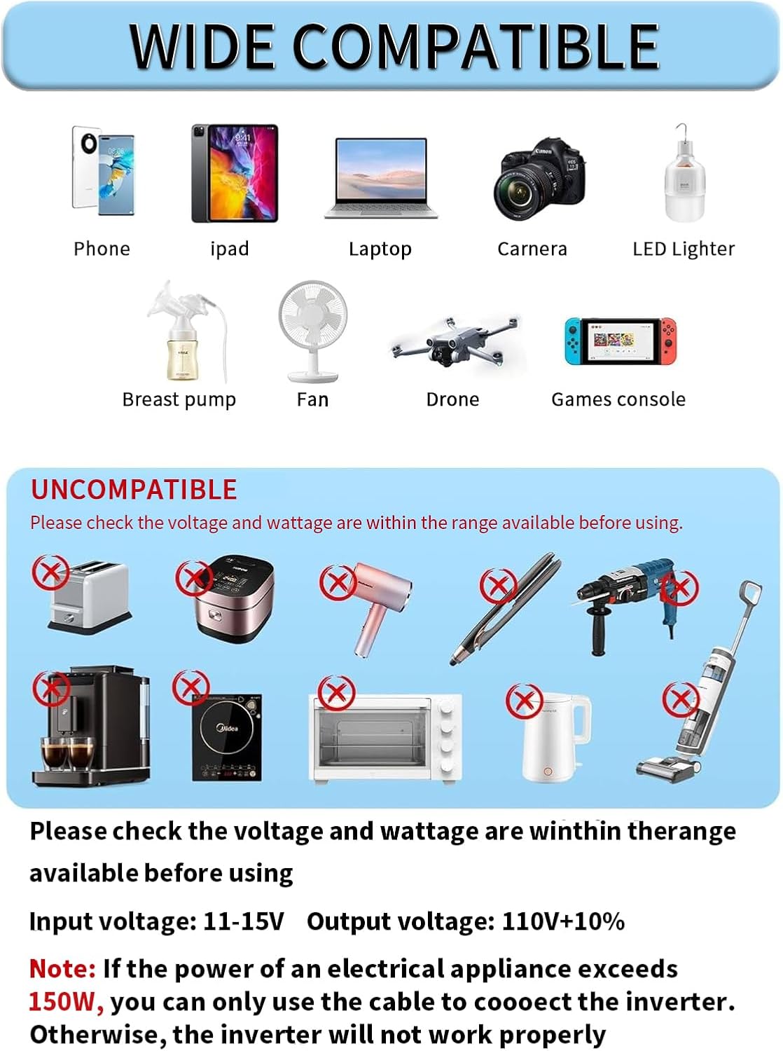 - [Broad Applications] - The outlets are so convenient it is enough to plug in two larger sized plugs at the same time.Use usb cable to connect car cigarette lighter sockets to power your device.Use a 12V battery system to connect with it to power your device in home or outdoors for emergency,outdoor activities,outage.