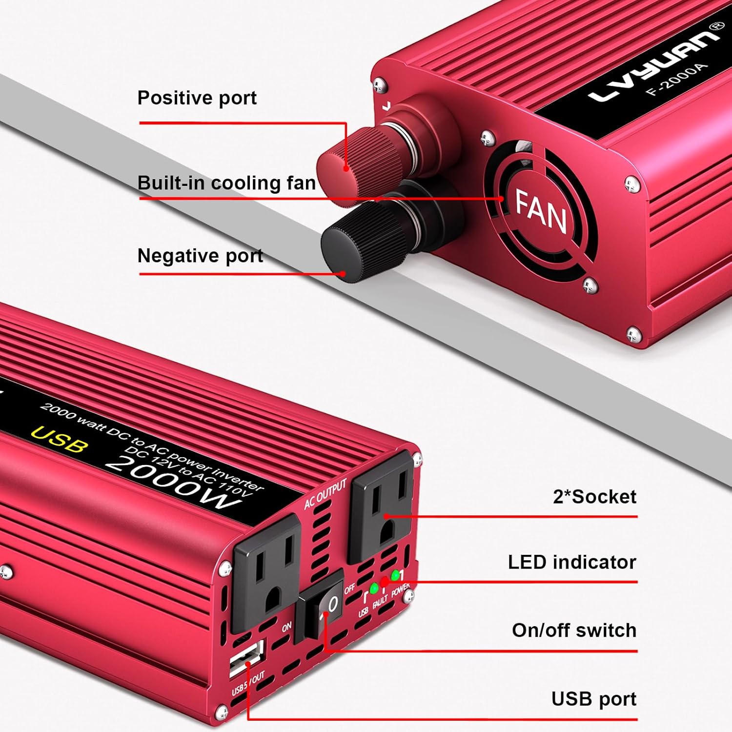 - [Inverter Charger Multi-Protection] - Built-in 2 replaceable 50A fuses,1 cooling fan.Safe charging design provides protection for you and your device,this power inverter has over voltage,overload,over-current,under-voltage,overheating,short circuit protection,polarity reverse protection.