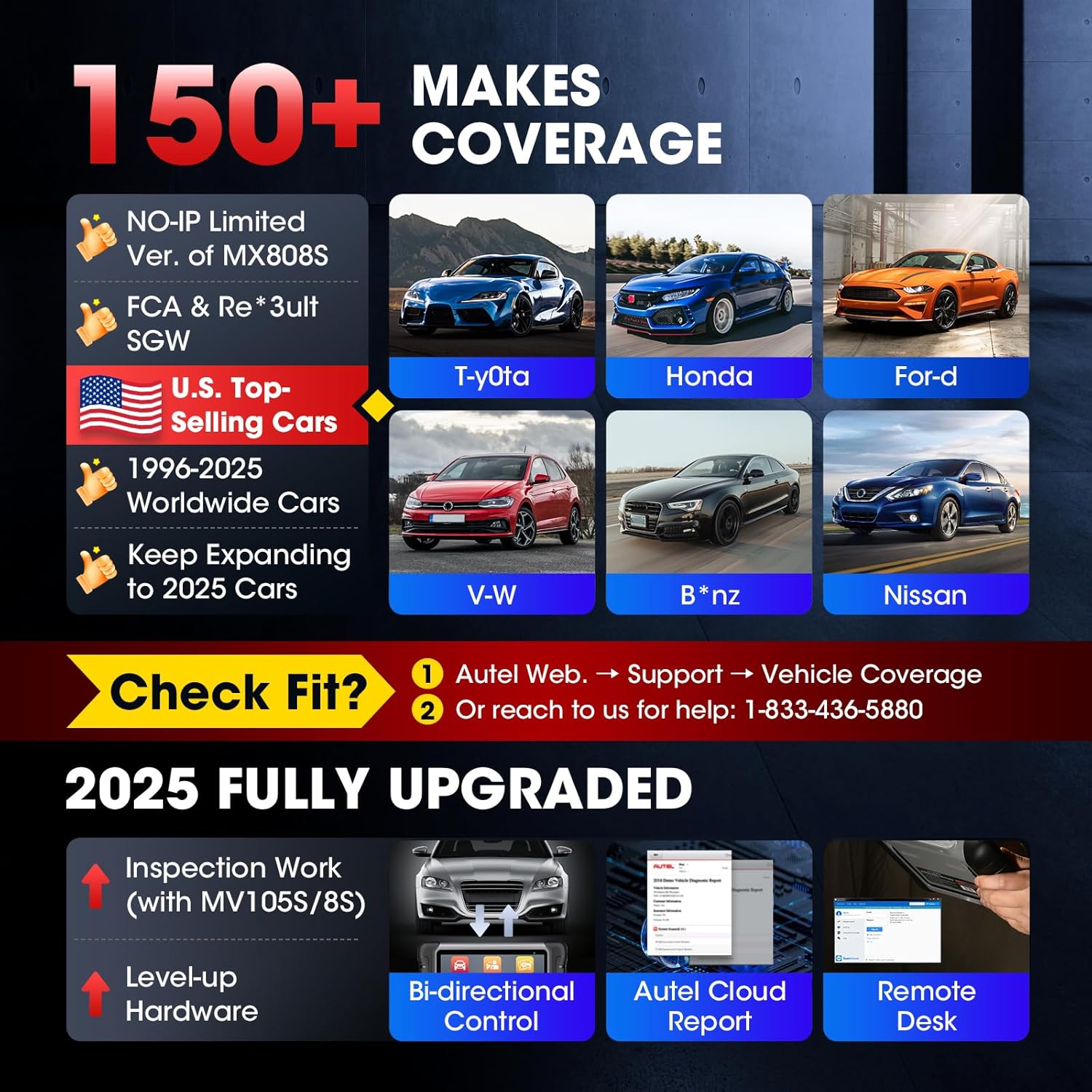 - 【FOR UPDATES AND COMPATIBILITY ISSUES】♻️To ensure optimal performance, always keep your MK808S updated via Settings > Firmware Upgrade. Your device includes one year of fr.ee software updates. After that, all offline features will continue to function without updates. 🚗With support for over 150 car brands (specific capabilities vary by model), you can verify compatibility by checking Autel Web.> Support> Vehicle Coverage or reaching to our support team at 1-833-436-5880. We’re here to help!