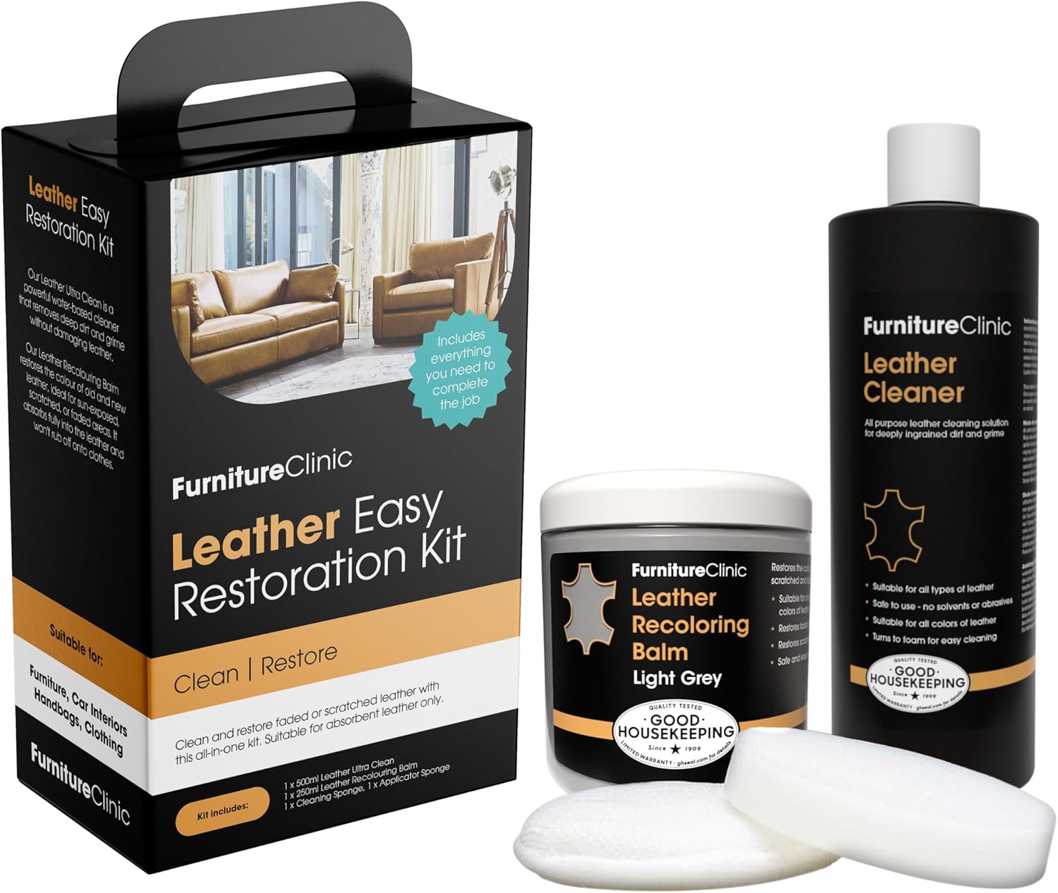 - LEATHER REPAIR KIT FOR FURNITURE INCLUDES: The 17 fl oz (500ml) Leather Cleaner ($19.95 value) and a 8.5 fl oz (250ml) Leather Re-Coloring Balm ($24.95 value) and Sponge & Cloth. With the leather balm it's quick & easy to restore the color to all absorbent leathers, ideal for restoring the color to faded and worn leather. Use on leather from a dark to light shade and great for Re-Coloring areas that have been exposed to sunlight or direct heat