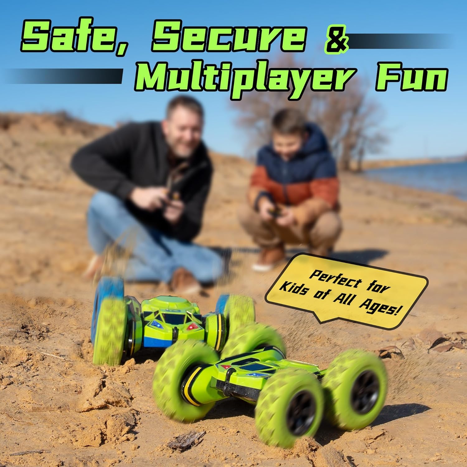 - Race up to 6 cars at a time,NO Problem: The fully functional RC stunt car features a dual-joystick controller with 2.4 GHz frequency, has good anti-interference performance, allows to race up to 6 trucks at a time, and provides a range of up to 160ft.