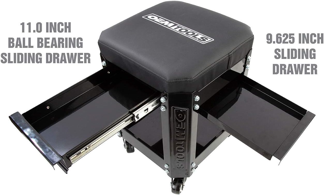 - Ample Tool Storage: Two sliding drawers and under-chair storage keep tools, parts, and accessories organized and within reach. A great feature for mechanics who need quick access to essentials while working on vehicles.