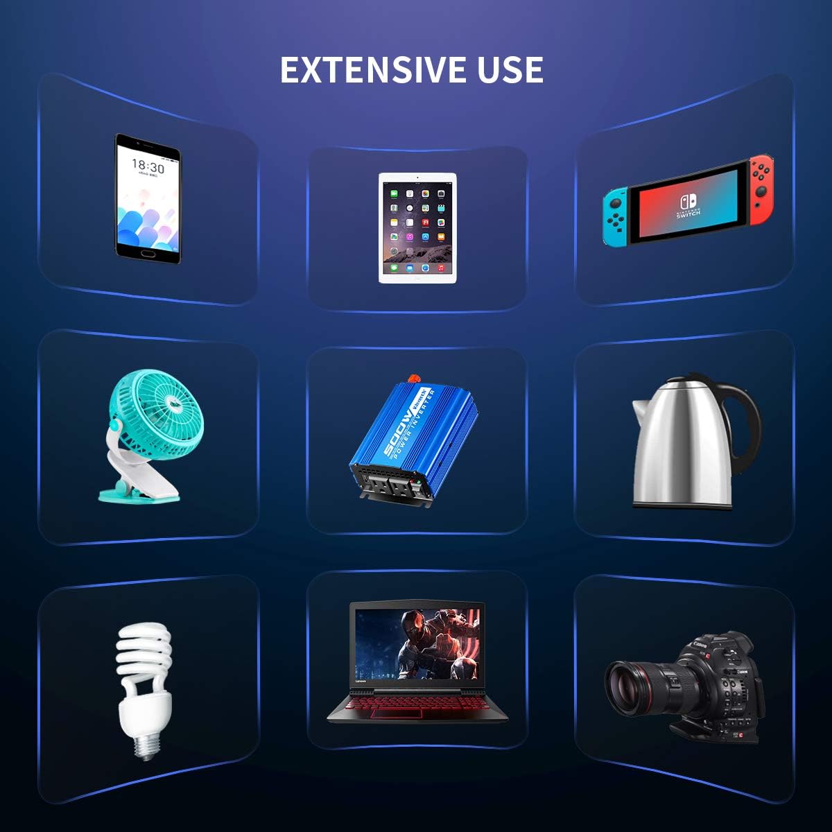 - [Use of Charging Port] This inverter converts 12V DC to 110V AC. 2 AC outlets can charge any electrical appliance less than 500W, such as laptops or any other household appliance under 500 watts. And 2 2A USB ports for charging USB-powered devices such as cell phones and tablets. So this car battery power inverter perfect for vacations, work trips, outdoor work, road trips, and camping or anywhere that power is needed.