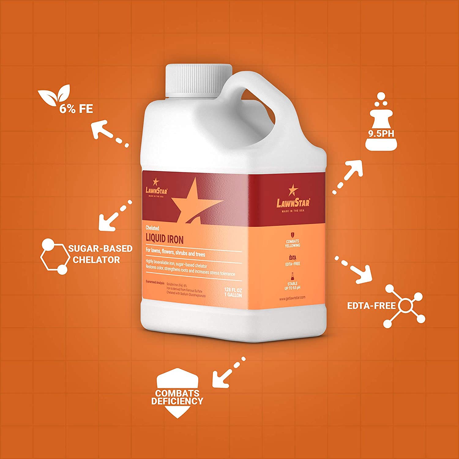 LawnStar Liquid Iron (1 Gallon) for Plants - Multi-Purpose, Suitable for Lawn, Flowers, Shrubs, Trees - Treats Iron Deficiency, Root Damage & Color Distortion – EDTA-Free, American Made