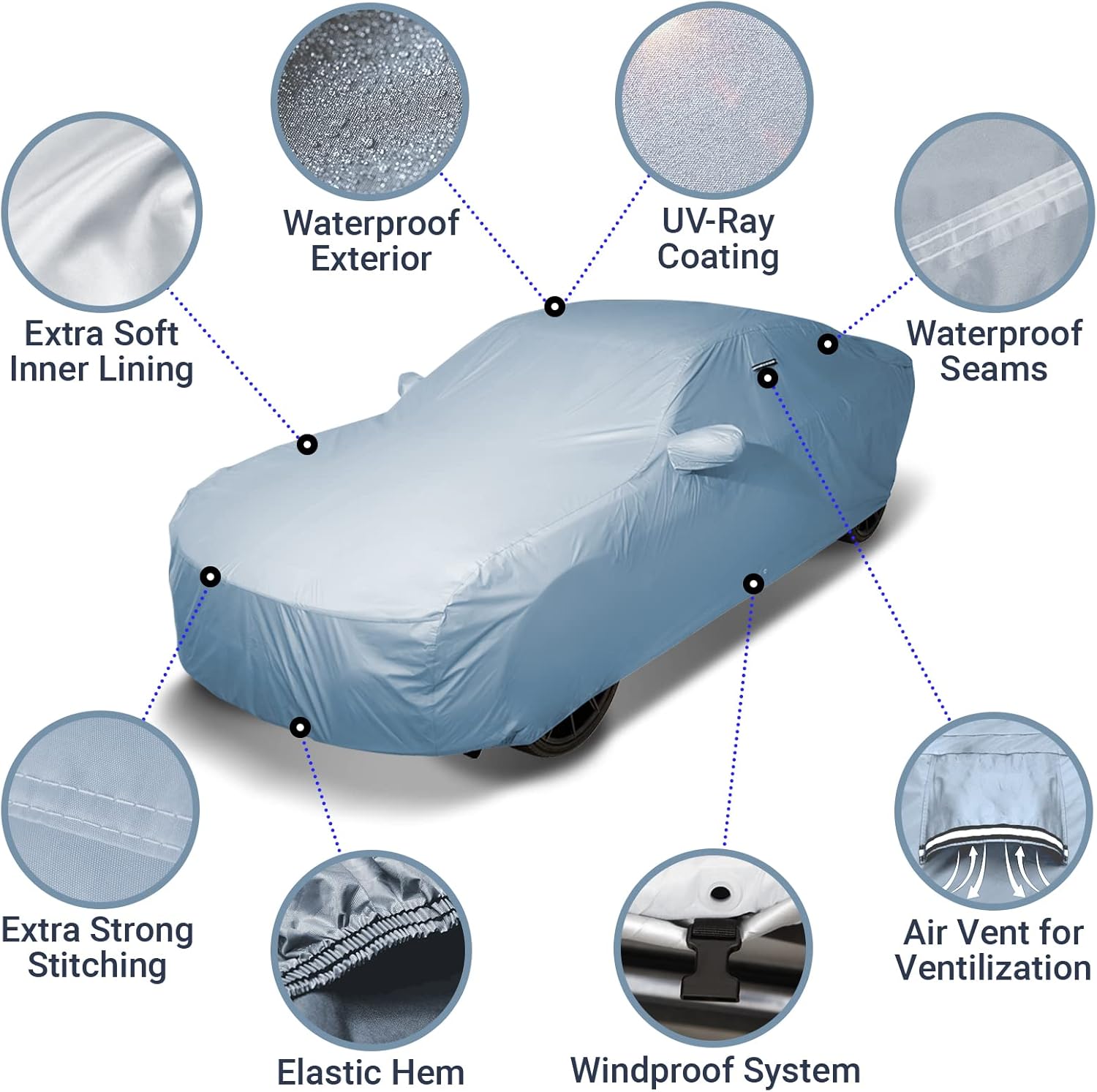 - ADVANCED FEATURES FOR SUPERIOR PROTECTION: Engineered for durability, our cover features waterproof-lined seams to prevent any leaks, as well as ventilation that allows airflow and reduces humidity buildup, keeping your car dry. The multilayered high-grade GSM material is machine-cut and bond-pressed for ultimate strength and long-lasting protection, no matter the weather conditions.