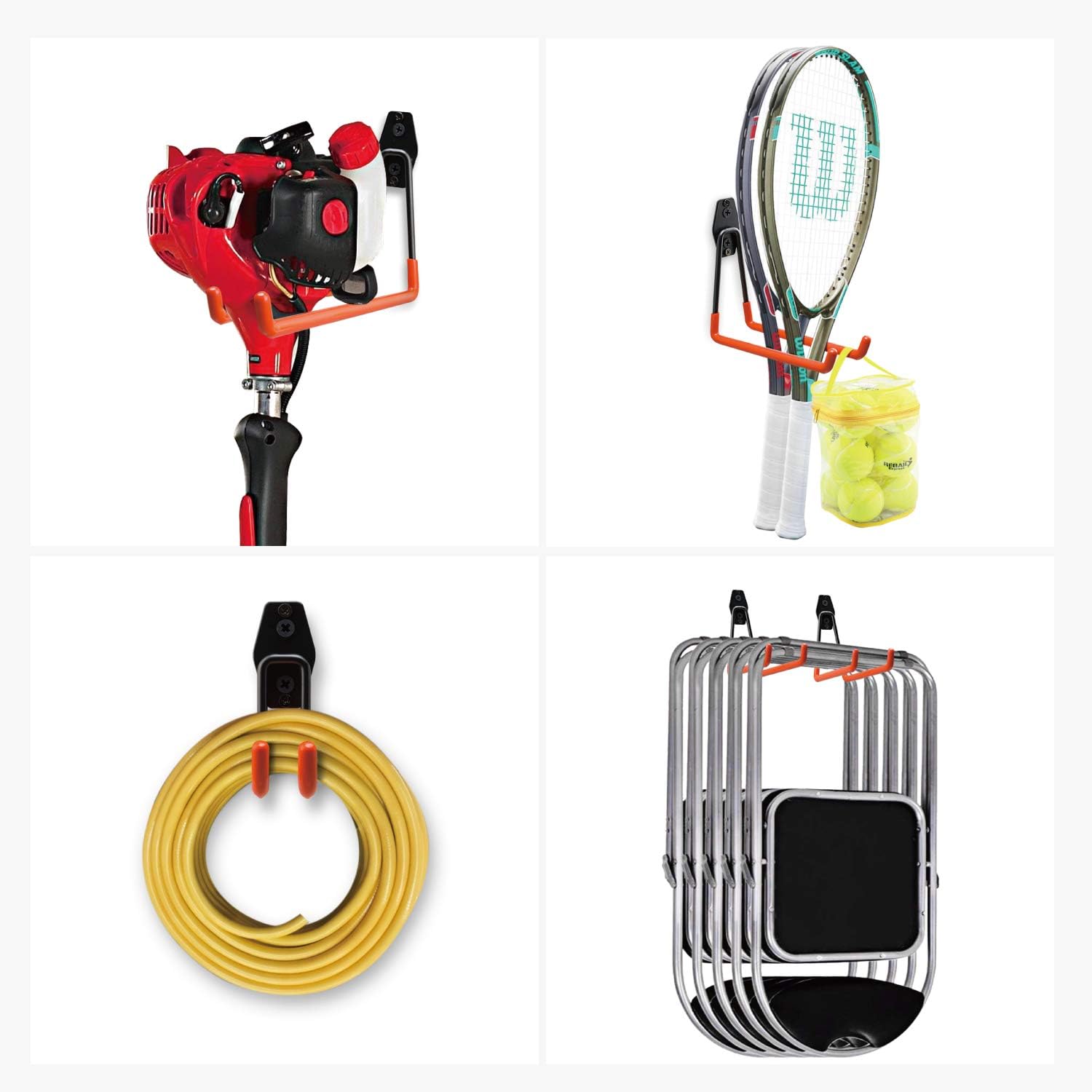 Garage Hooks, 12 Pack Wall Storage Hanger with 2 Extension Cord Straps, Heavy Duty Tool Holder for Utilities Organization, Wall Mount Rack for Garden Lawn Tools, Ladders, Bike, Ski (Orange)