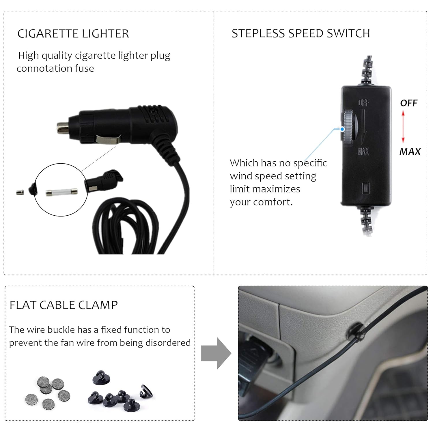 - 【Air Circulation】AOWOSA Car Fan is perfect for removing off moisture of interior windshield on cold rainy days and reducing unwanted hot air, cigarettes smoke or dust. It also can eliminate pet odor which makes you feel uncomfortable. The car fan features sturdy and high quality grip that can be installed tightly in your car seat. this car fans comes with some black clamps to keep the wire clean.