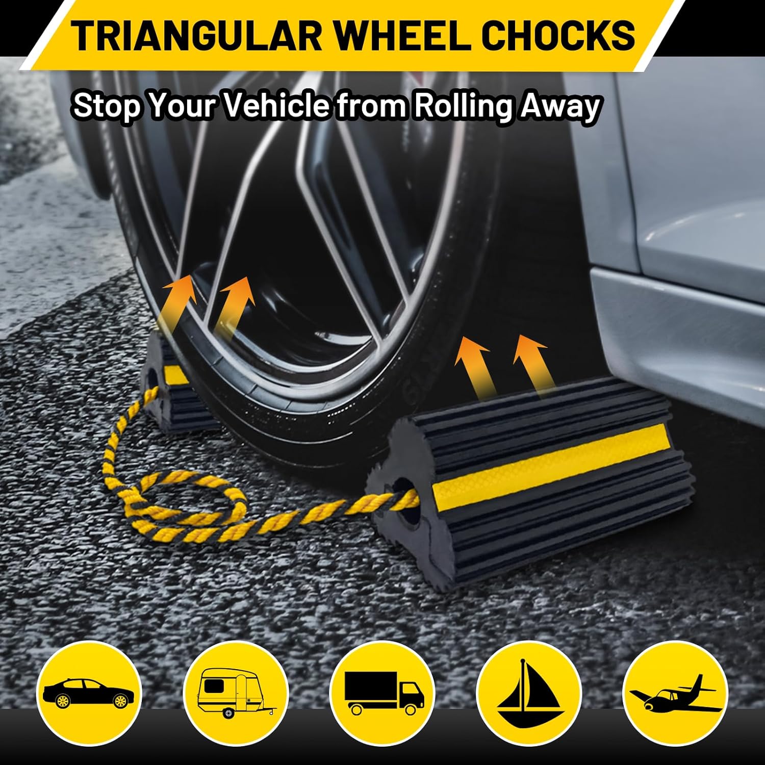 - Multifunction: These chocks can be used for a wide range of purposes, perfect for chocking cars, trucks, trailers, small airplanes, RVs, dumpsters, boats, horse trailers, vans, and more to prevent your vehicle rolling away