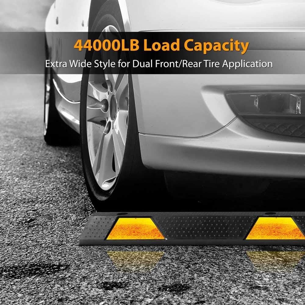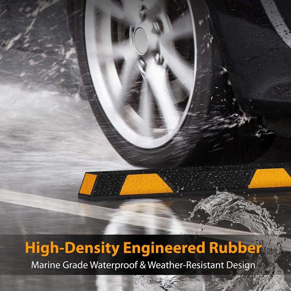 - 44000LB LOAD CAPACITY: These garage bumpers for parking have a max load capacity of 44, 000 lbs. w/ only 10 cm height in order to protect most of the new cars w/ low ground clearance. Resistant to water, UV light, moisture, oil and extreme temperatures