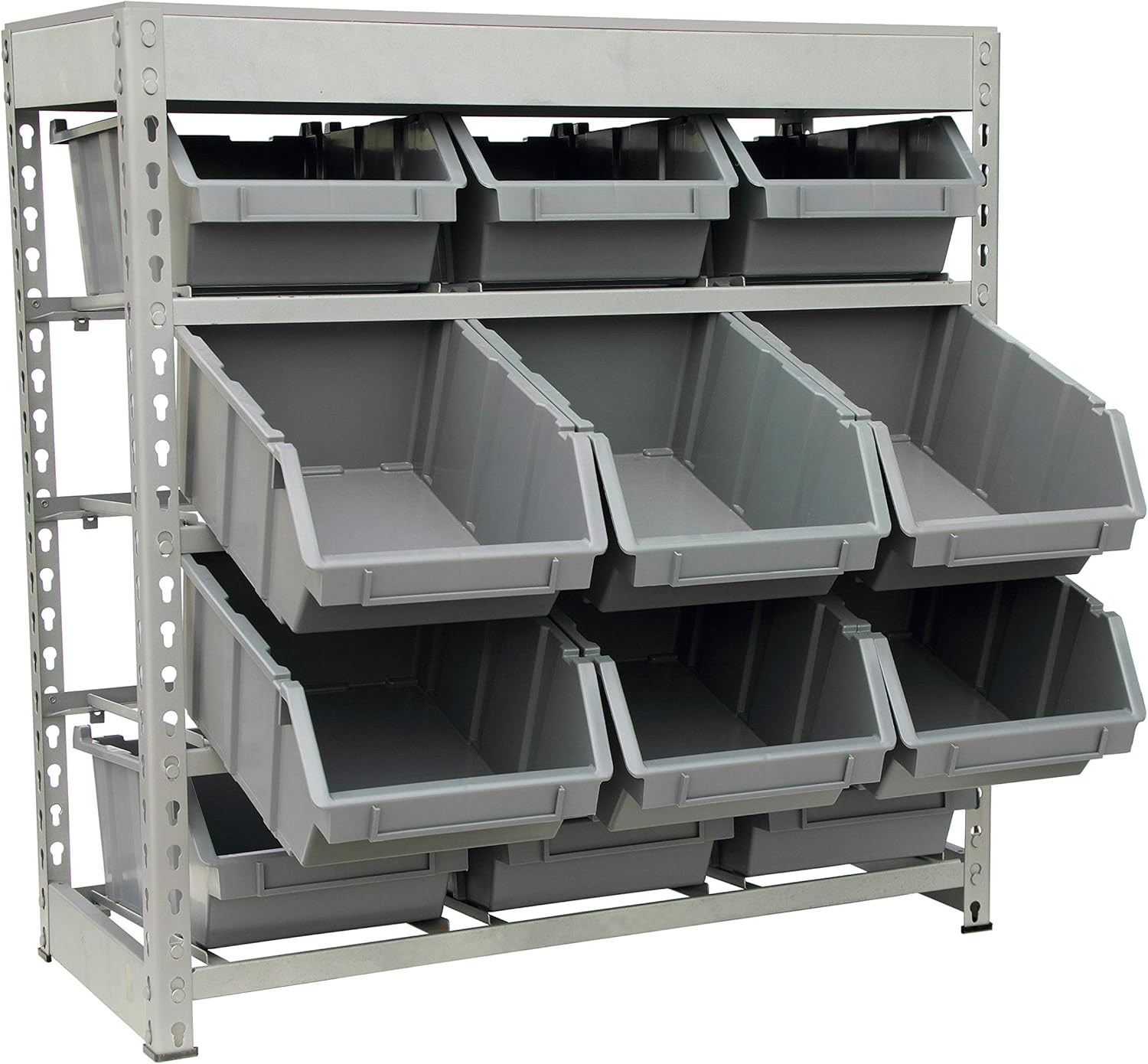 - 12 bins in 4 tiers / or Optionally, 9 bins in 3 tiers and leave some space on the floor