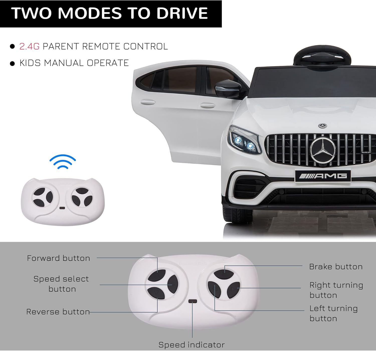 - Parents or Kids Control It: Aosom's mercedes benz kids car is controlled by kids with steering and foot pedal, and features a working safety belt to ensure that kids remain seated in place while driving, but is can also be controlled by a parent via the remote control.