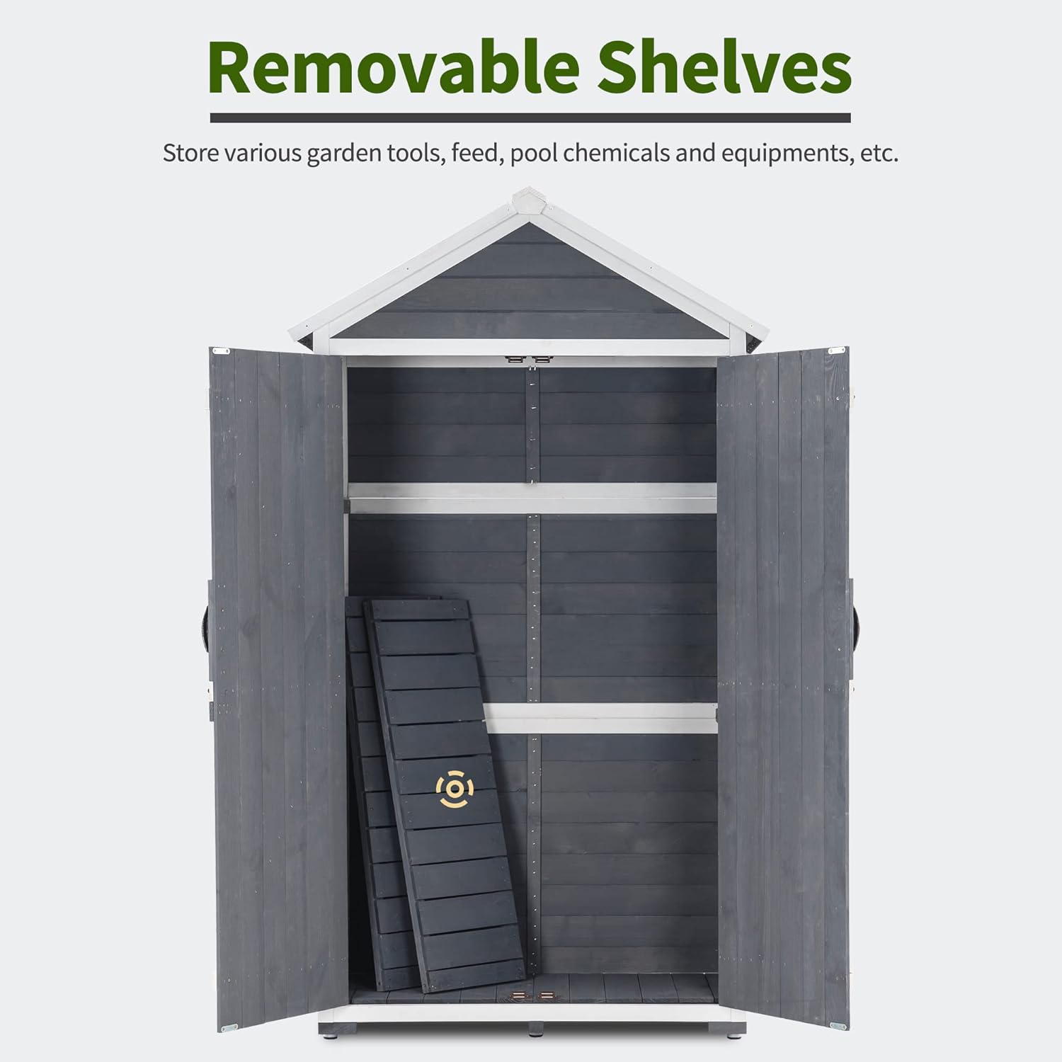 - Customizable Storage with Removable Shelves: This outdoor storage cabinet features 2 removable shelves, allowing you to create up to 4 different storage spaces; Perfect for organizing garden tools, feed, pool chemicals, and equipment, it offers flexibility to meet your specific storage needs