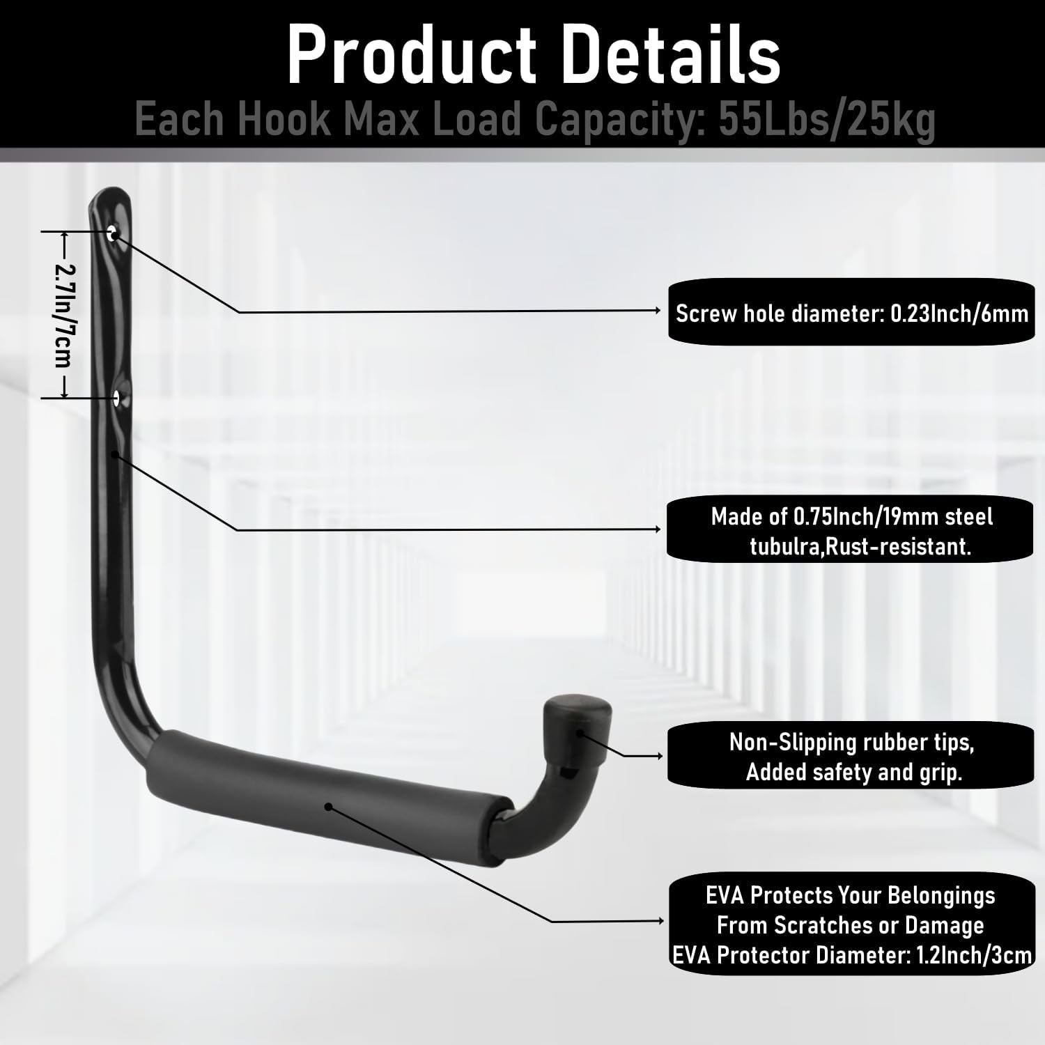 - HIGH QUALITY MATERIAL: Made of tubular steel which is durable and sturdy,storage hangers are powder coated and rust resistant. Our large arm garage storage hook has EVA protector, which can protect your hanging items perfectly.