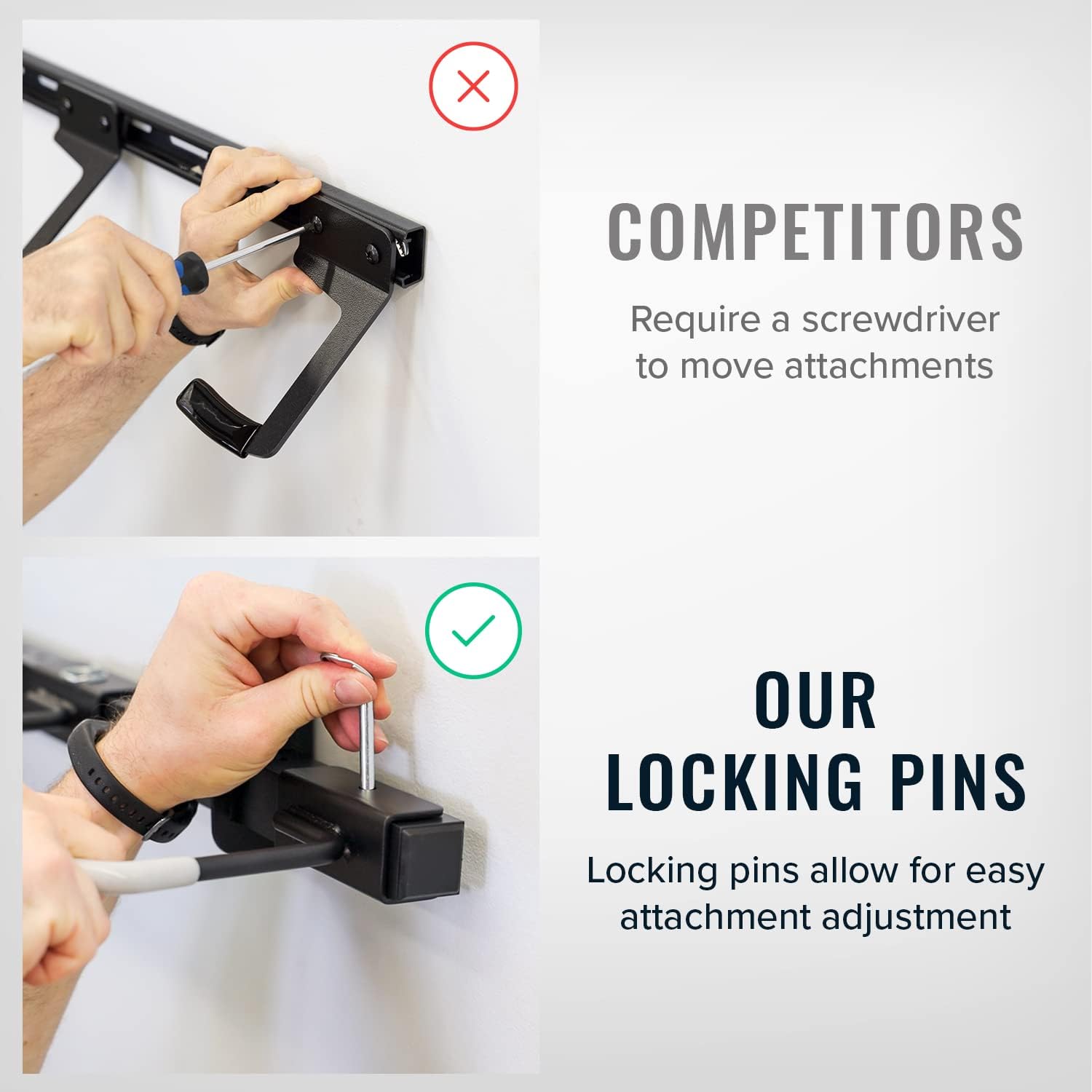 - Adjustable Wall Mount Bike Storage – Customize your garage bike rack setup with 45 mounting slots and movable hooks. Easily reposition the bike hangers using the 3D locking pin system to accommodate wide handlebars, unique frames, and various bike sizes.