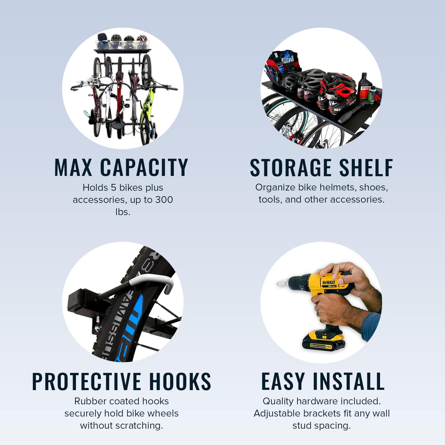 - High Capacity Bike Storage Rack With Shelf – This wall mount bike rack garage system holds up to 5 bikes and includes an overhead bike wall mount shelf to store helmets, shoes, bags, and gear bins. A complete bike storage solution for road, mountain, and kid bikes.