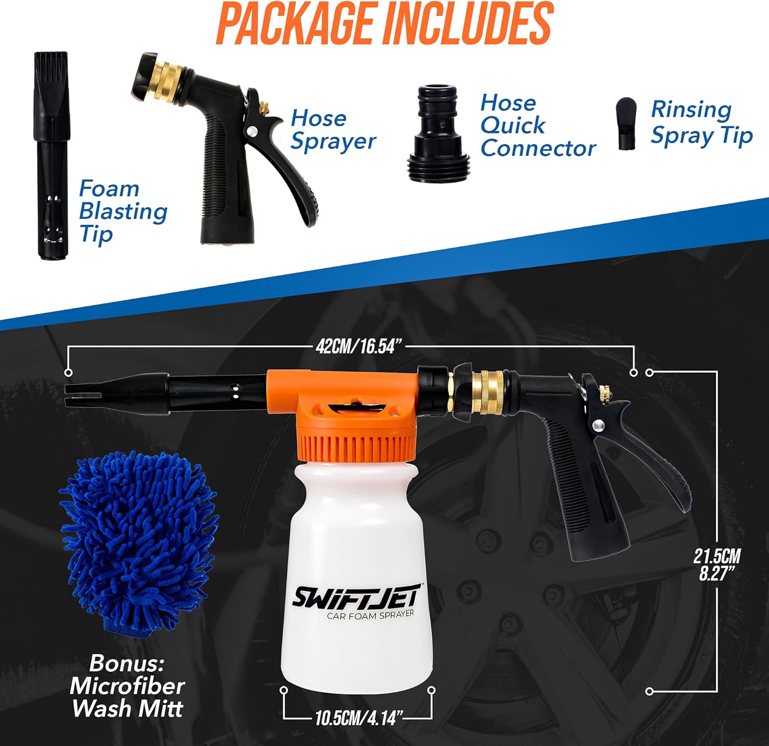 SwiftJet Car Wash Foam Gun + Microfiber Wash Mitt - Car Foam Sprayer - Car Wash Kit - Foam Cannon Garden Hose Sprayer - - Car Accessories for Men - Snow Foam Blaster (Orange Foam Gun with Mitt)