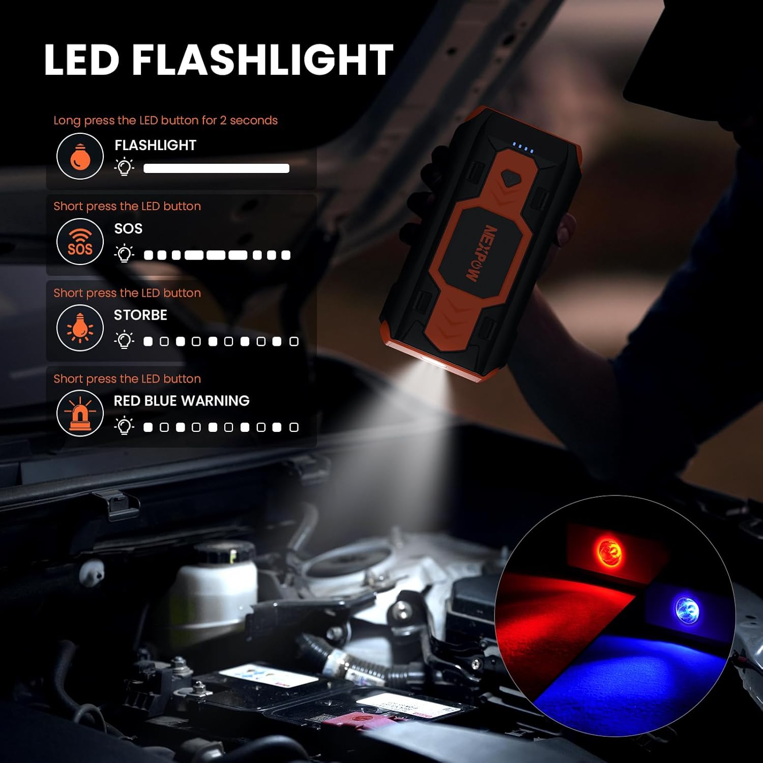 - 4 LED Modes: Not just a car battery jump starter, the NEXPOW jump starter comes equipped with a very bright LED functioning as an emergency flashlight. The blue-red alternate light can function as a traffic hazard warning signal in the event of an accident. 4 modes (Spotlight/Strobe/SOS) & Red Blue Warning