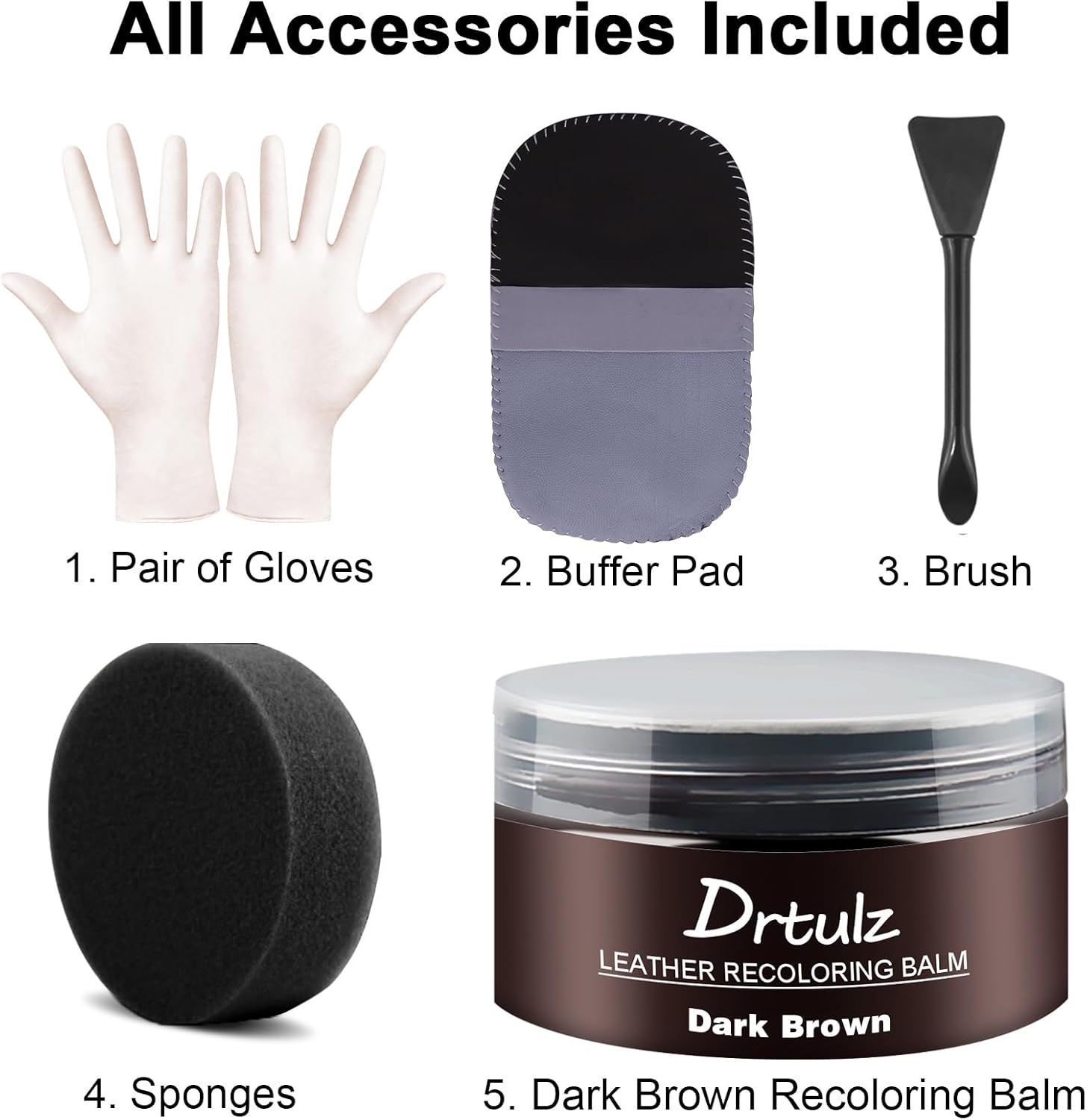 - [ Leather Repair Kit For Furniture ] Dark brown leather polish contains natural oils that can penetrate the pores of your leather to make your leather couches look shiny and new. Just apply it to leather, then apply and allow to air-dry for 10-20 minutes or use a hairdryer to speed up drying in just 1-2 minutes