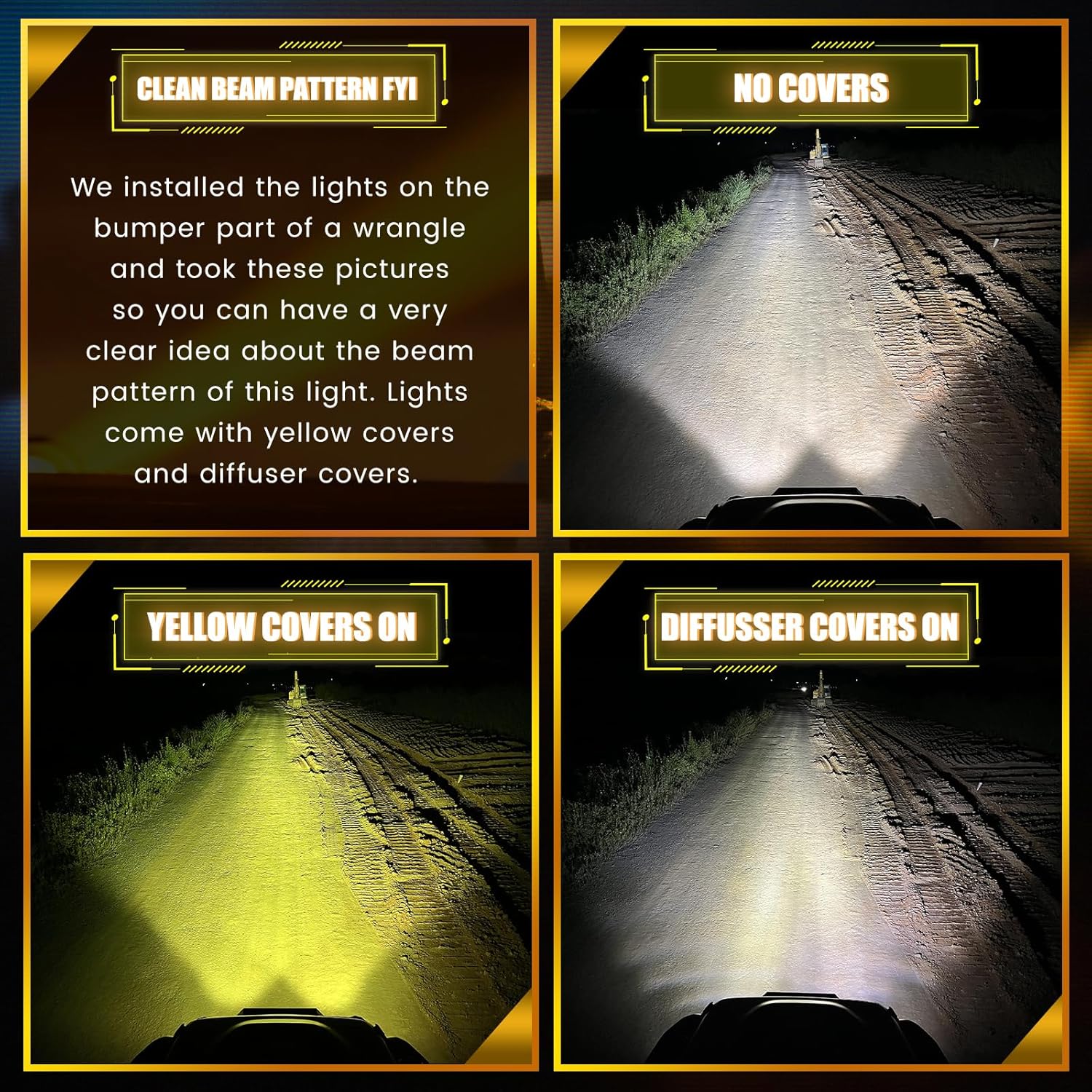 - [High Brightness] We installed the lights on the bumper part of a wrangle and took pictures and video. You may have a check on the picture 2 attched and get a very clear ideaa bout this lights beam pattern. Alao, video is attched for your reference.