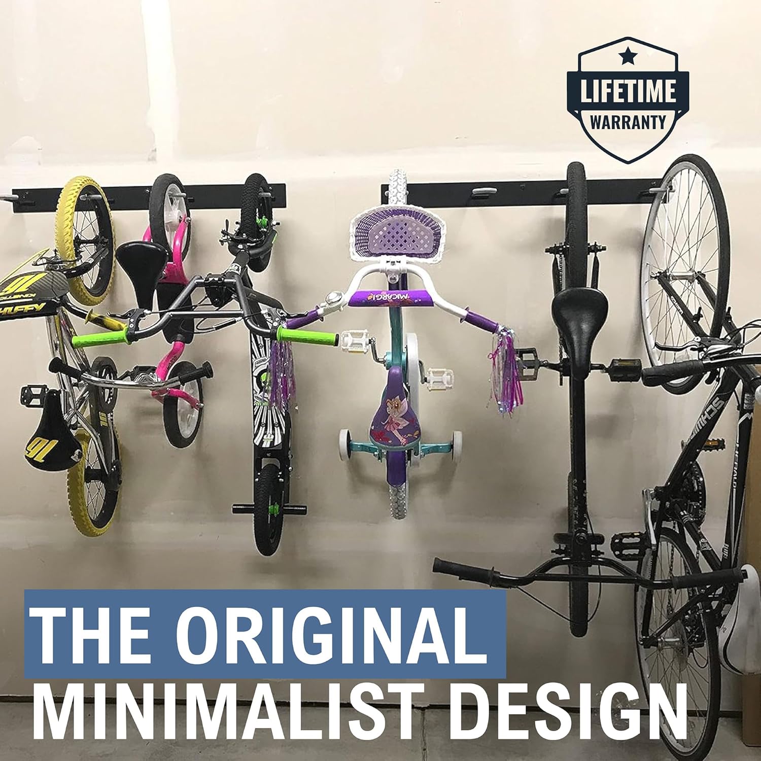 - Bike Rack for Garage - Get organized and hang up to 8 bikes on the wall with (2) heavy-duty wall bicycle racks. Clear up floor space and protect your bikes from excess damage.