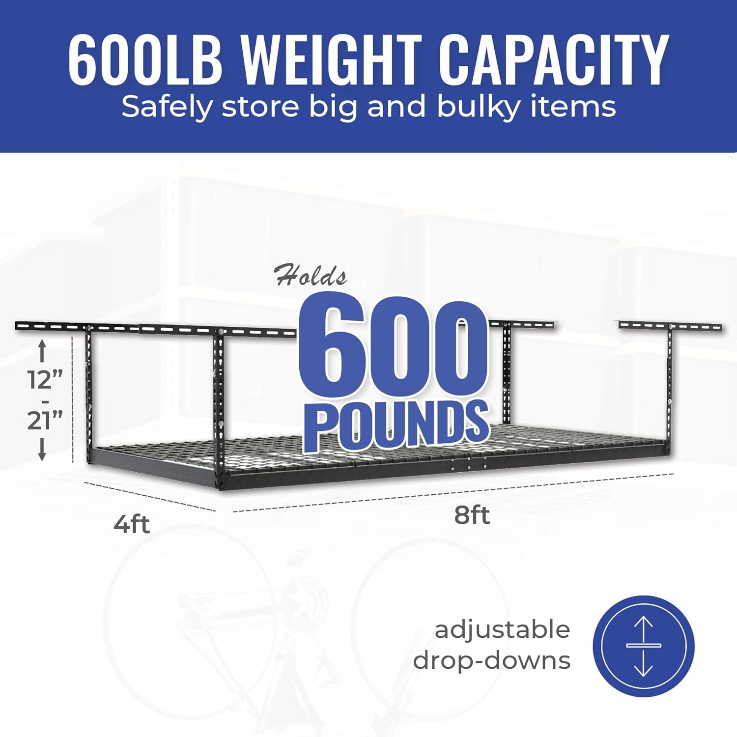 - INDUSTRIAL STORAGE RACK: Our industrial rack is a great fit for virtually any garage. It features a full 600 pound weight capacity and adjustable height ranging from 12 to 21 inches from the ceiling. Store storage bins with ease with our hanging storage rack.