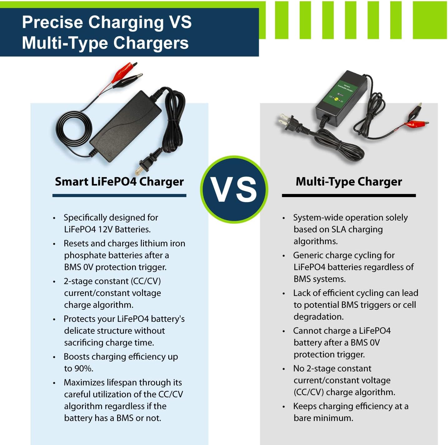 - Intelligently Programmed: Our charger is uniquely designed for 12V LiFePO4 batteries, implementing the special 2-stage constant current/constant voltage (CC/CV) charge algorithm with smart LED indicators. Additionally, the charger is designed to reset all types of BMS when active by allowing current into batteries reading from down to 0V