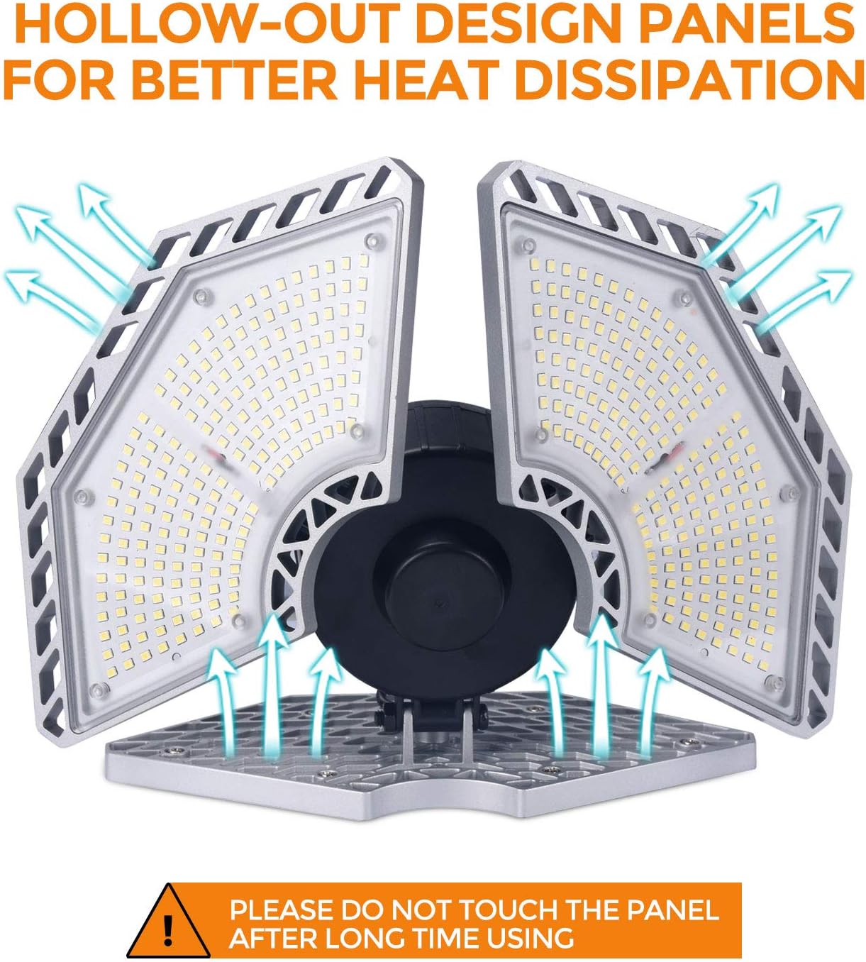 - Excellent heat dissipation and adjustable design, the garage light adjustable LED Panel Heads can be folded to 120°, and the maximum coverage angle can reach 360°, which can make the light cover a wide area and meet your needs for different lighting angles and areas. The ceiling light panel is made of premium aluminum alloy material, which is more solid and more durable. The hollowed-out panel design is good for heat dissipation and stability, which helps extend the life of the light.