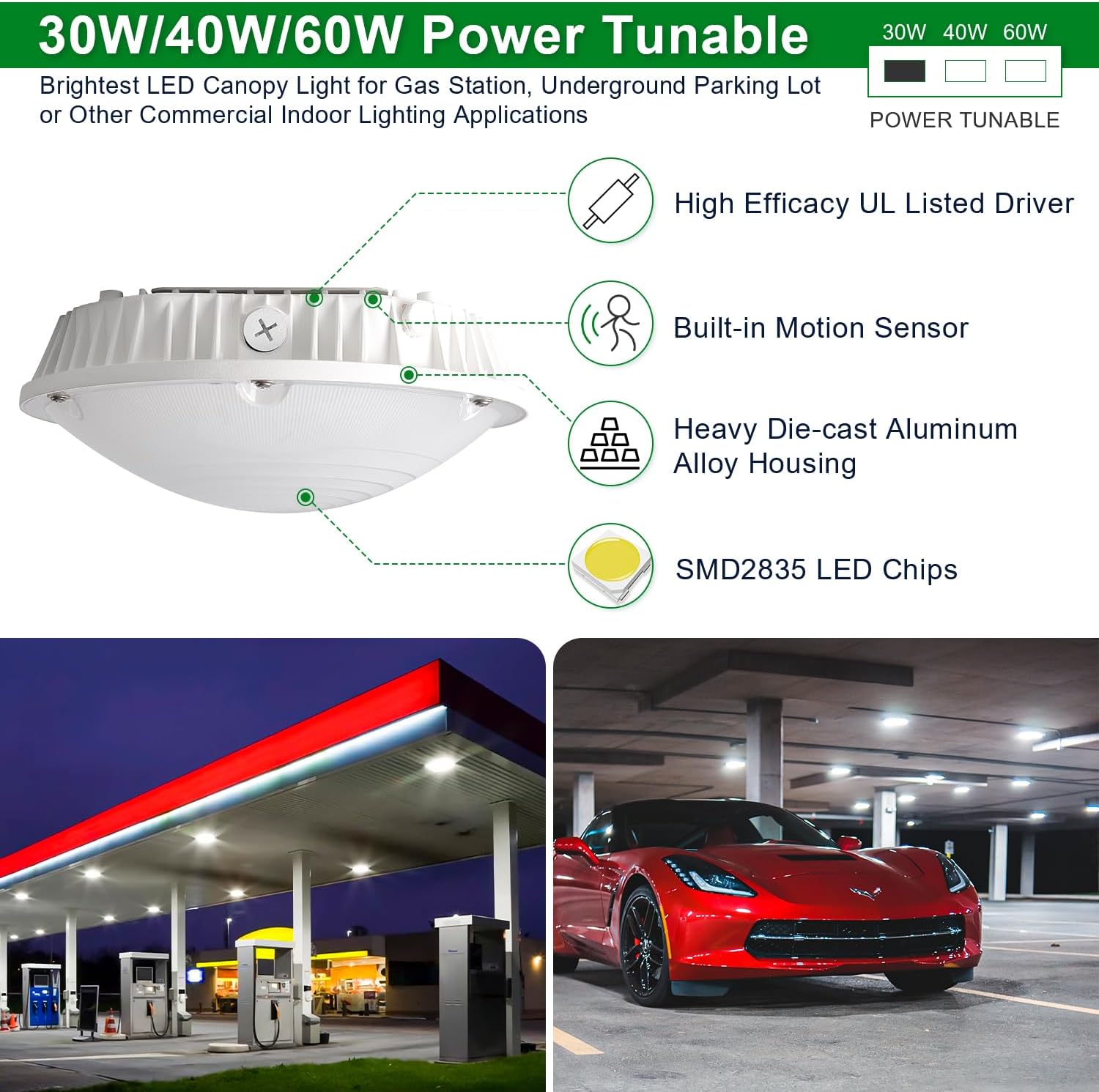 OSTEK LED Canopy Gas Station Light with Motion Sensor 30W/40W/60W Power Selectable 5000K LED Parking carport Lights 90-277V IP65 Commercial Residential Lights DLC & UL Listed