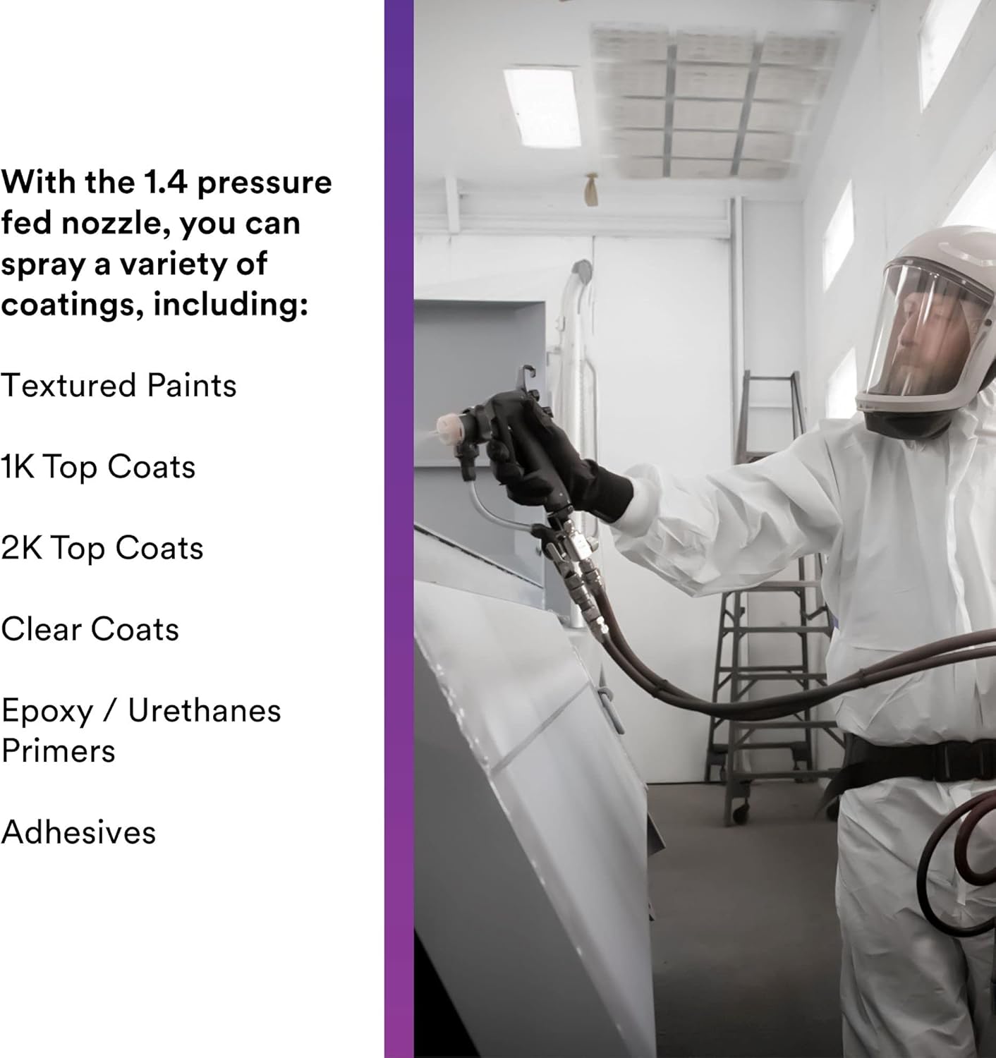 - VERSATILE: 1.4 Size nozzle ideal for textured paints, 1K top coats, 2K top coats, clear coats, epoxy and urethane primers and adhesives