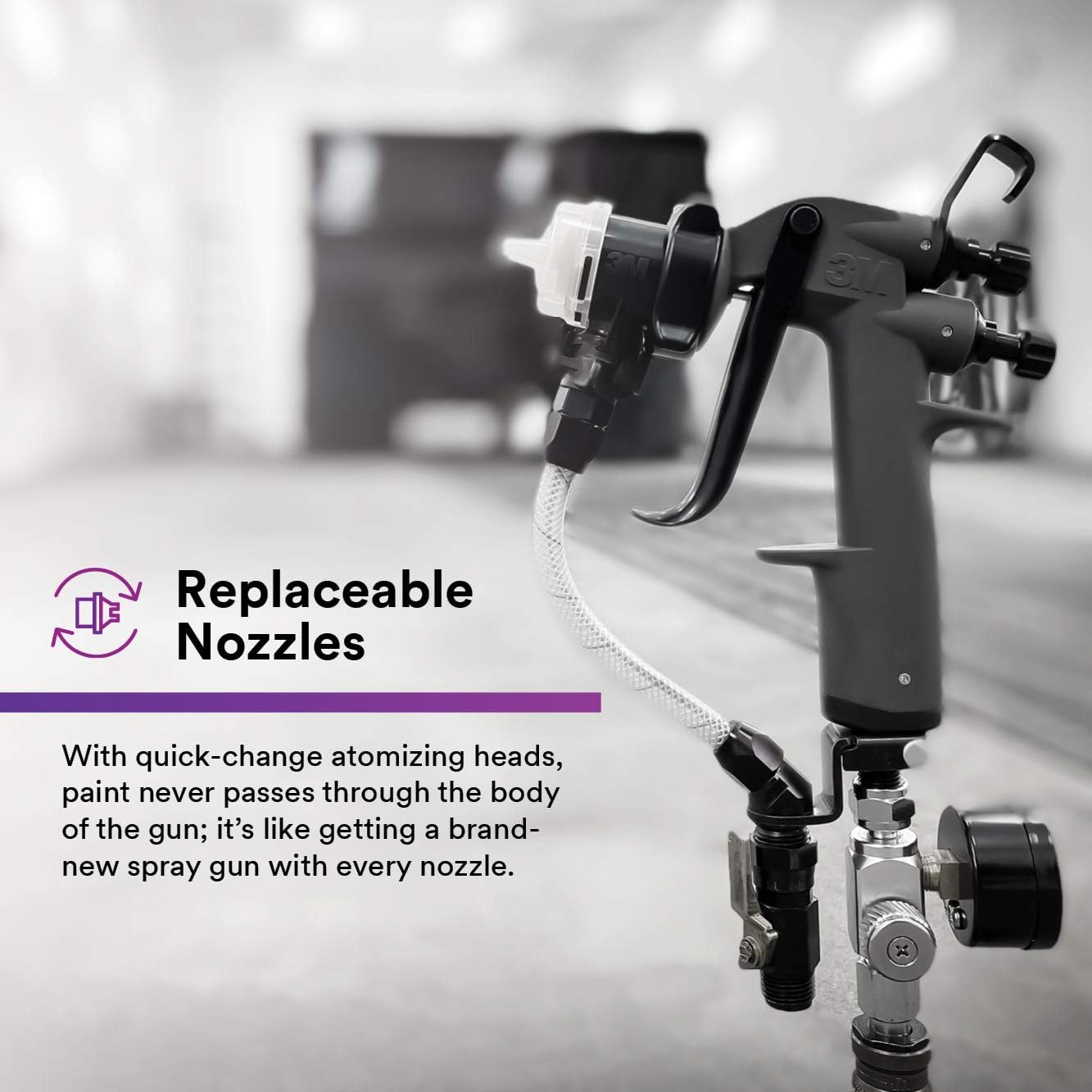 - REPLACEABLE NOZZLES: With quick-change atomizing heads, paint never passes through the body of the gun; it’s like getting a brand-new spray gun with every nozzle