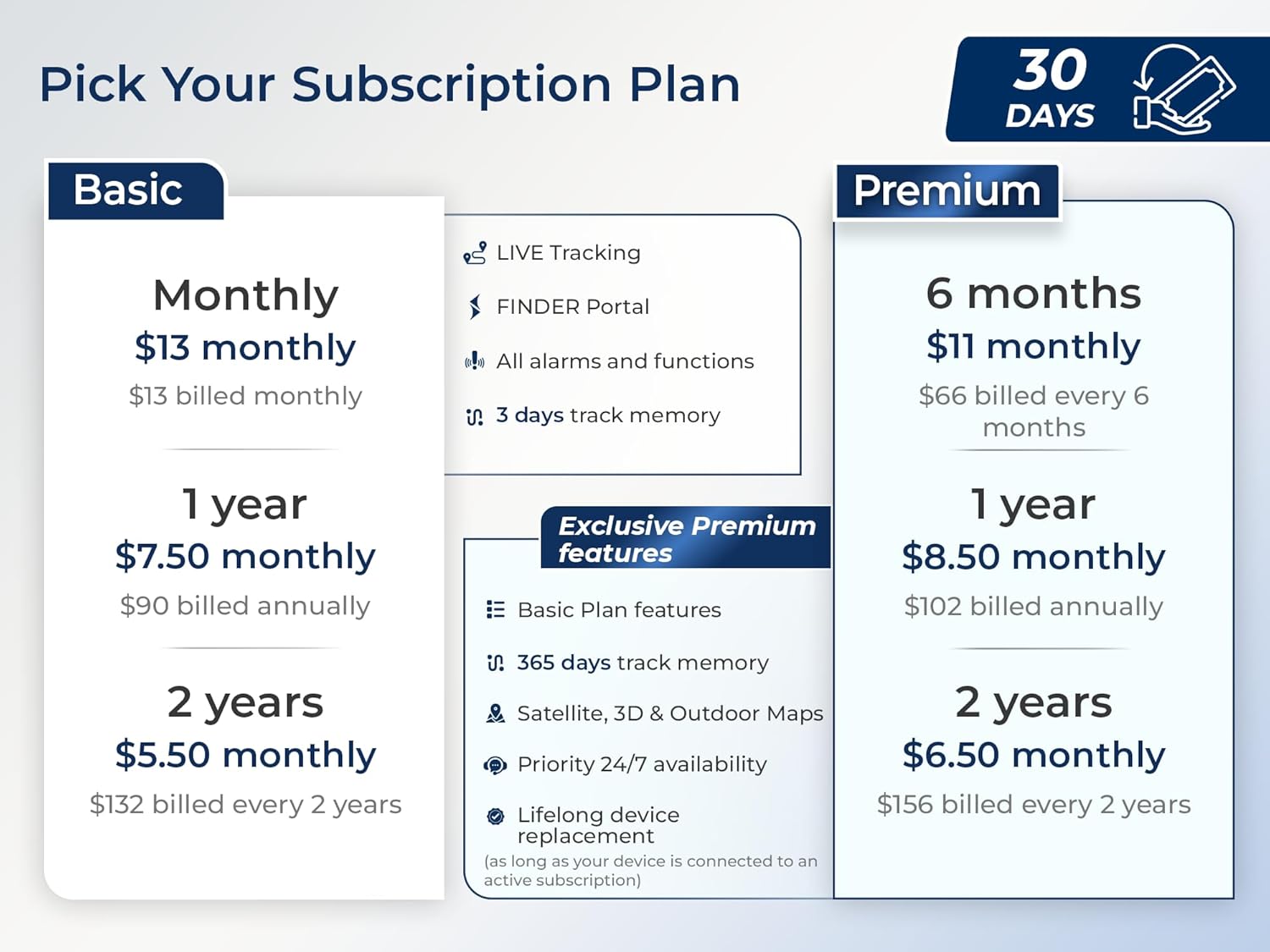 - FLEXIBLE SUBSCRIPTION PLANS - Easily manage your GPS tracking through our free Android and iOS app. Each device includes a pre-installed SIM card and access to 24/7 multilingual customer support. Choose from Basic or Premium service plans, available monthly or for up to two years, starting as low as $ 6.5 USD per month. Lifetime device replacement program available (terms and conditions apply).