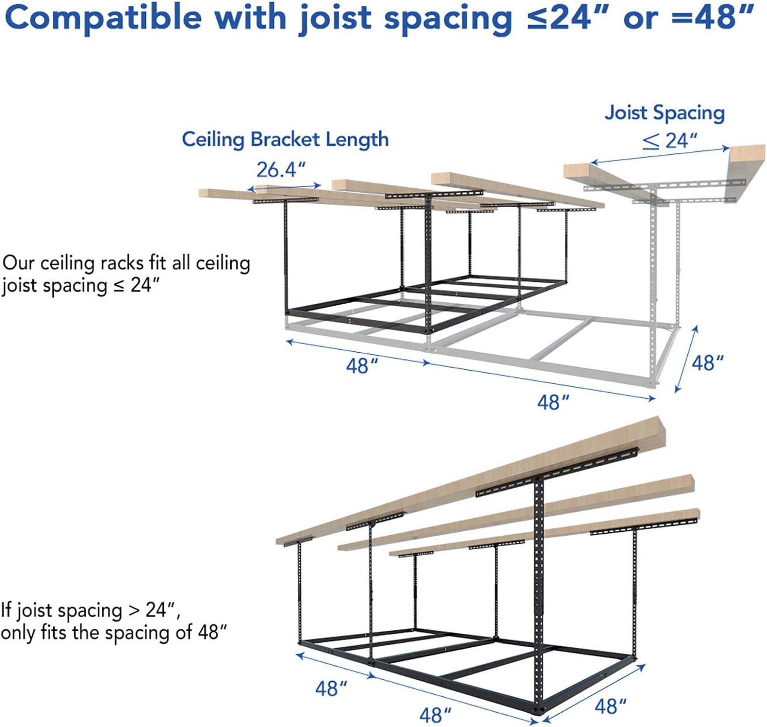 - DIY INSTALLATION: Installation Template helps drill mount holes. This overhead storage rack fits all ceiling joist spacing ≤ 24", if joist spacing > 24",only fits the ceiling spacing of 48".