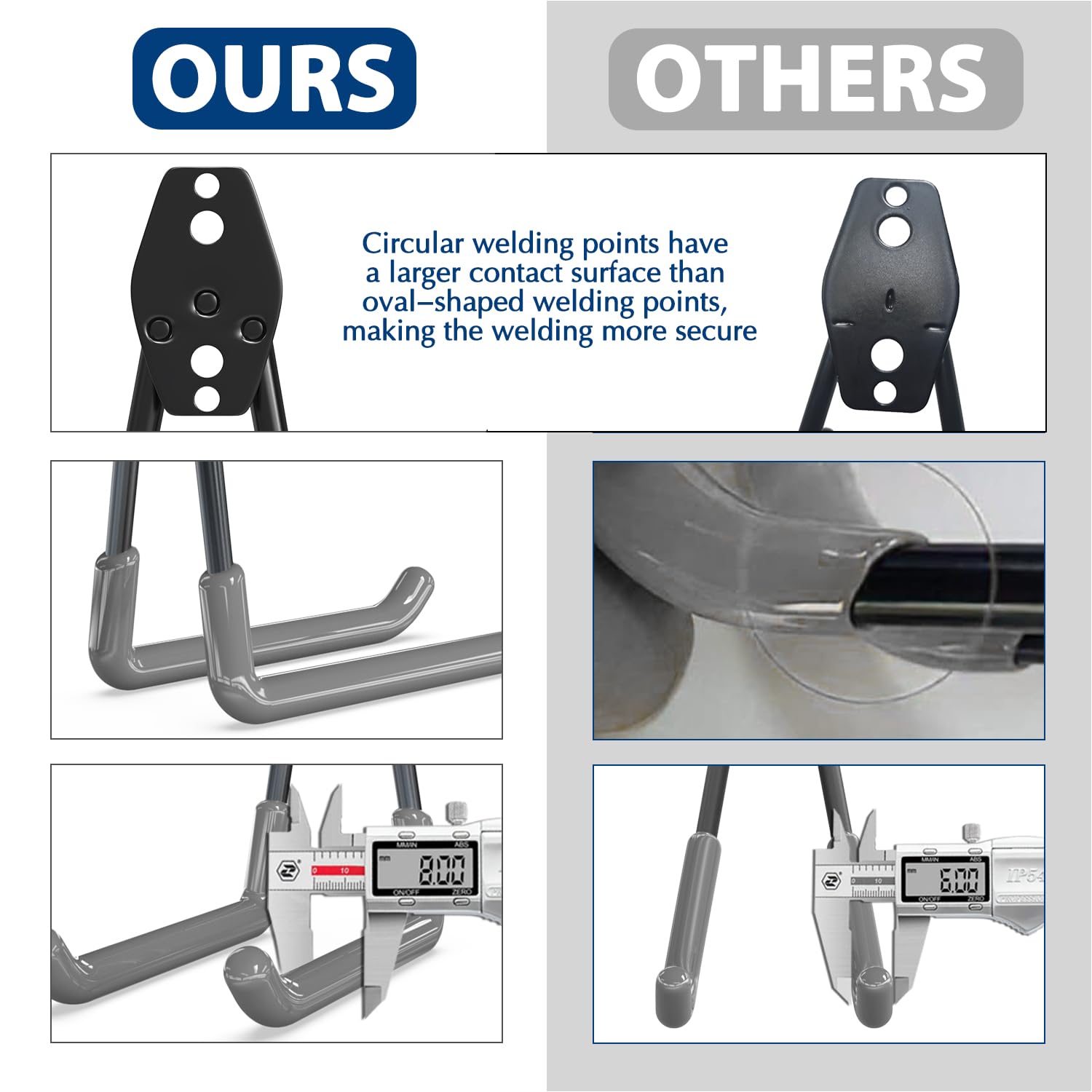 - Upgrade Design-Triangle 3 Welding Dot Support: Different from other similar garage hooks with only 2 welding spots, we designed 3 welding dot to connect the garage tool organizer with the base, offering higher security and no worrying about the rear steel panel splitting or falling off, a perfect choice of wall hooks for hanging heavy duty