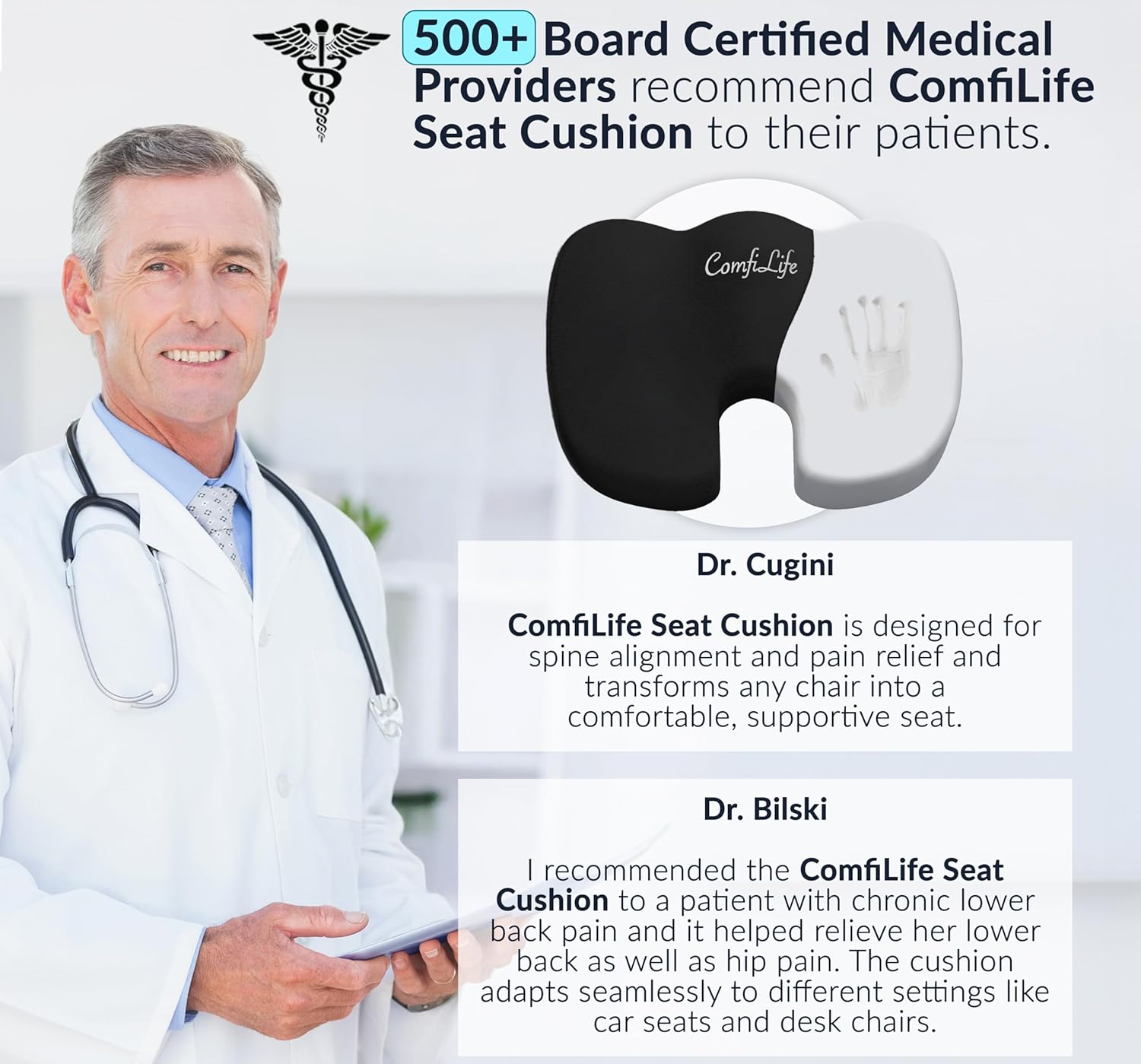 ComfiLife Premium Comfort Seat Cushion - Non-Slip Orthopedic 100% Memory Foam Coccyx Cushion for Tailbone Pain - Cushion for Office Chair Car Seat - Back Pain & Sciatica Relief (Black)