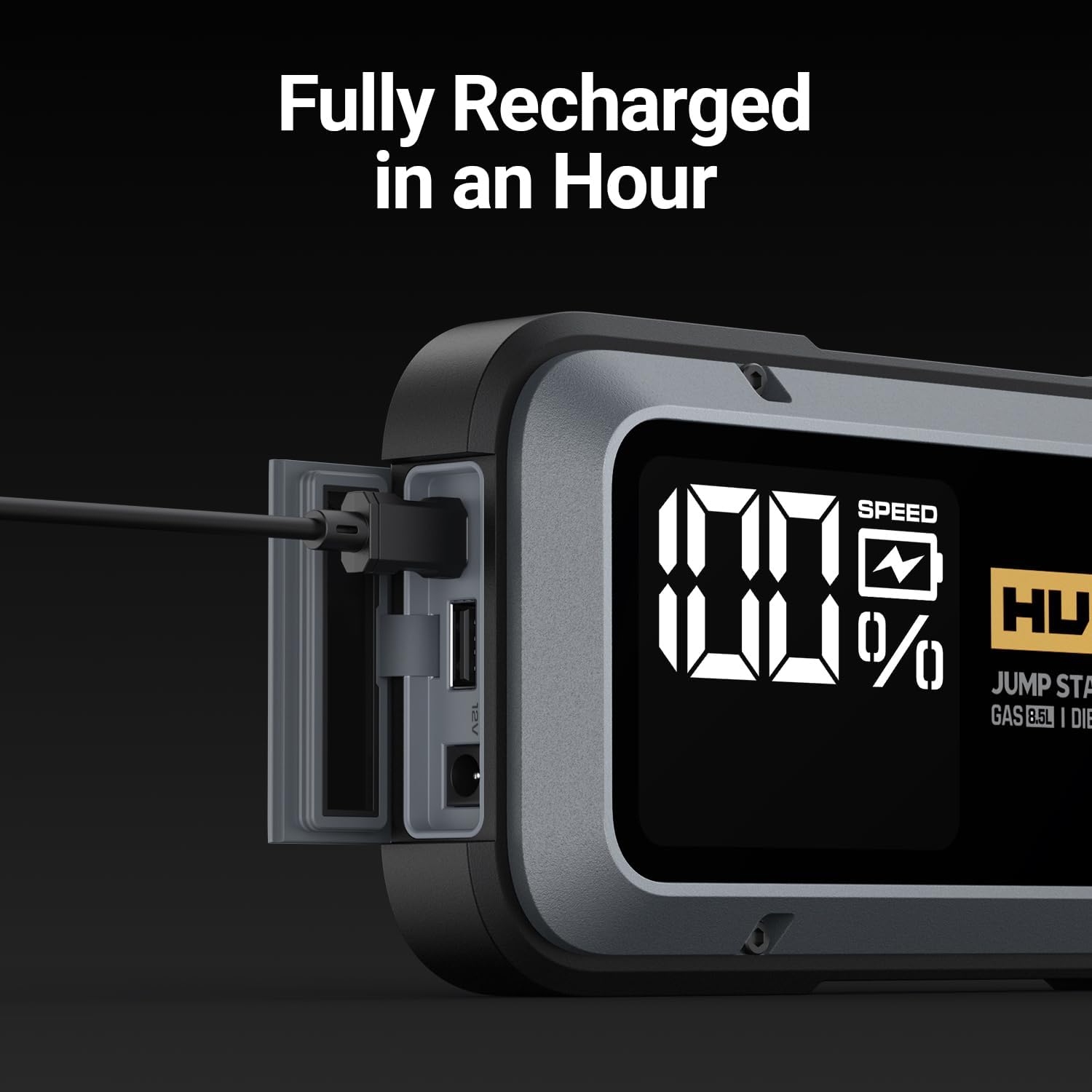 - [0% to 80% in Just 1 Hour]: With our advanced 65W Speed Charge Tech, this car battery jump starter recharges from 0% to 80% in just one hour and fully charges in 90 minutes. Once fully charged, it can hold power for up to 18 months. A quick 5-minute charge is enough for one emergency jump-start.