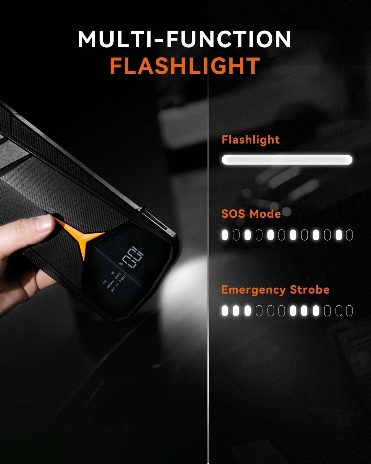 - 【Multi-Function】The specially designed indicator notifies you of incorrect use with an audible buzz and flashing lights. It also has a built-in LED flashlight with 3 modes: Flashlight, Strobe, SOS. The digital LCD screen clearly displays the remaining power. The 12V/10A DC port can power for other car products (cigarette lighter adapter is included).