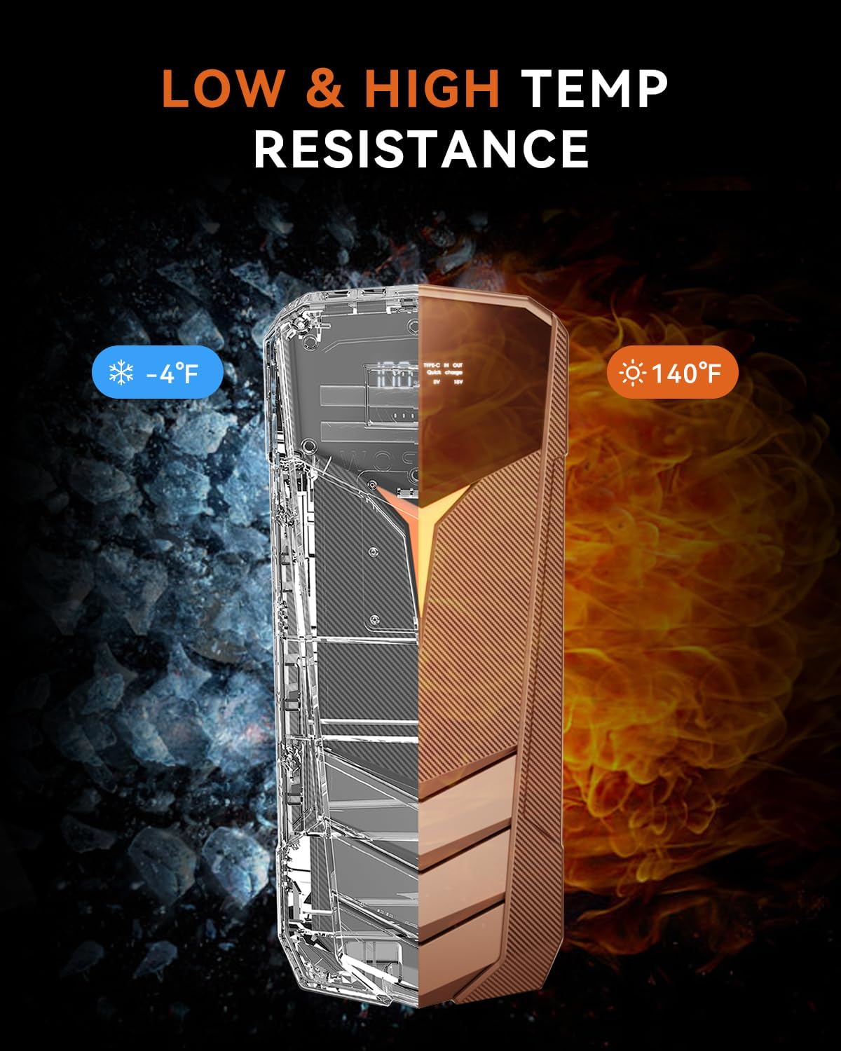 - 【Strong Protection】Advanced intelligent technology has spark proof protection, over charge protection, short circuit protection, over current protection, overload protection,over-voltage protection, reverse polarity protection, high temperature protection, low temperature protection etc. It can be started in extreme weather from -4℉~140℉.