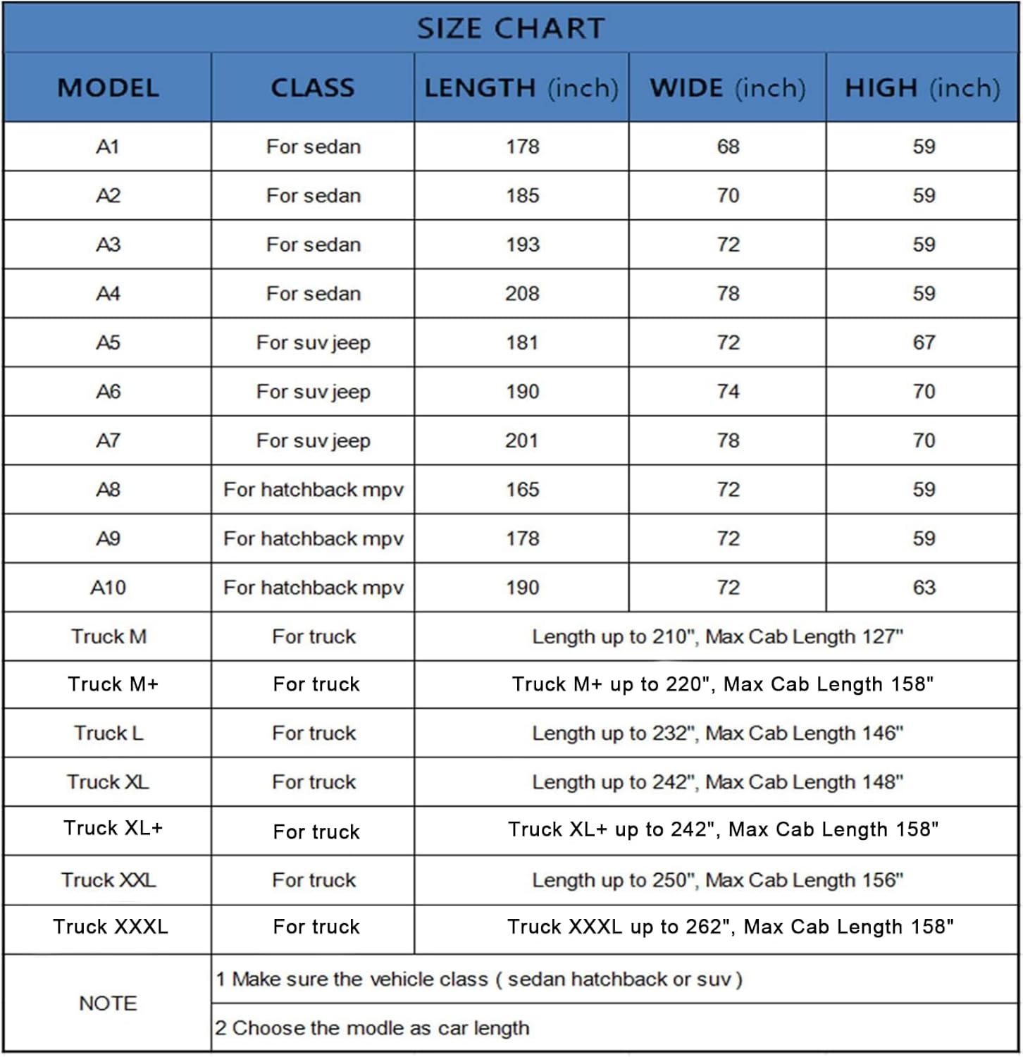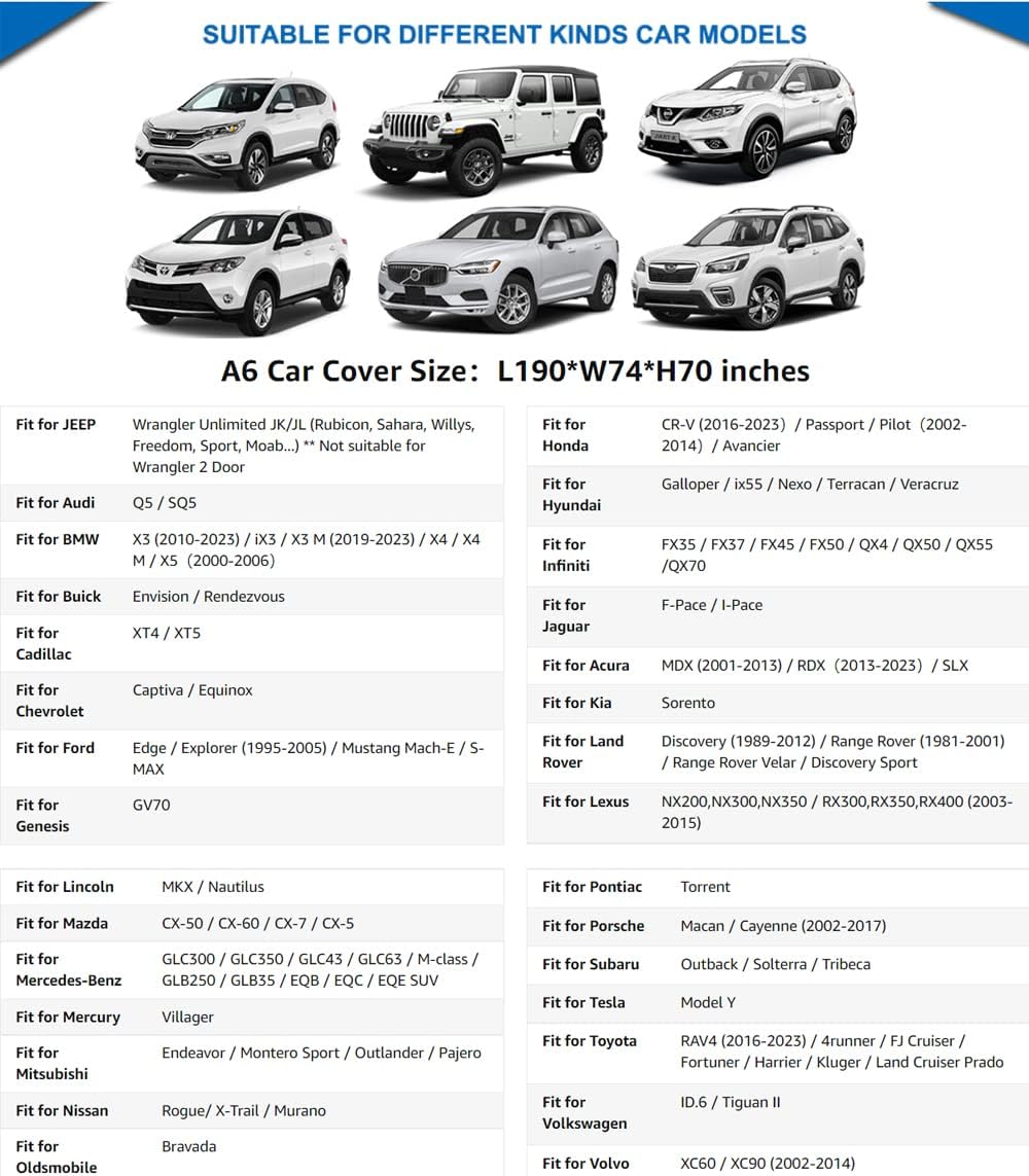 - 【Choose the Right Model】⎯⎯A6 suitable for jeep and SUV, Length 181-190 inches. (Not for hatchback sedan). For example SUV--Jeep Wrangler, Cherokee, BMW X3, Mazda CX5, Subaru outback, Toyota RAV4, Honda CRV,Bmw X3 X4, Audi q5,Volkswagen tiguan, Lexus rx350/NX200t, Subaru outback, Kia sorento, Hyundai santa fe,Volvo xc60/xc70, Chevy Equinox, Porsche Macan, Mitsubishi Outlander, Lincoln mkx etc.If you are not sure if your model is a good fit, look at the fifth model table in the main figure.
