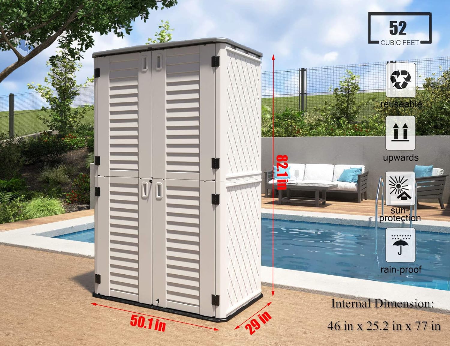 - 【PERFECT FOR STORAGE】 — This vertical lockable storage cabinet could place many kinds of tools, sundries, such as Lawnmower, pool hoses, pool pumps, etc.