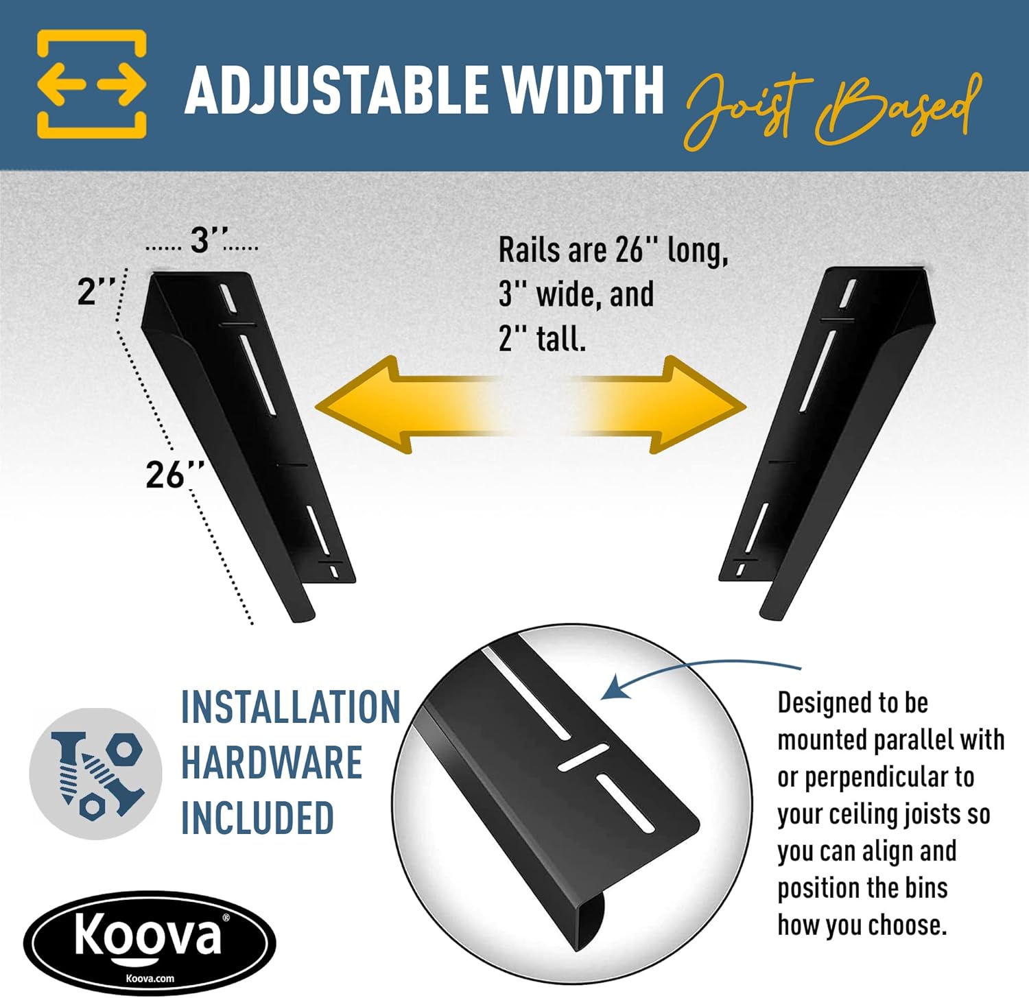 - Satisfaction Guarantee: Koova Ceiling Racks are engineered to last and let you store your storage bins. Made in the USA, we offer a lifetime satisfaction guarantee. If you are not happy with a product we will repair, replace or refund your money.